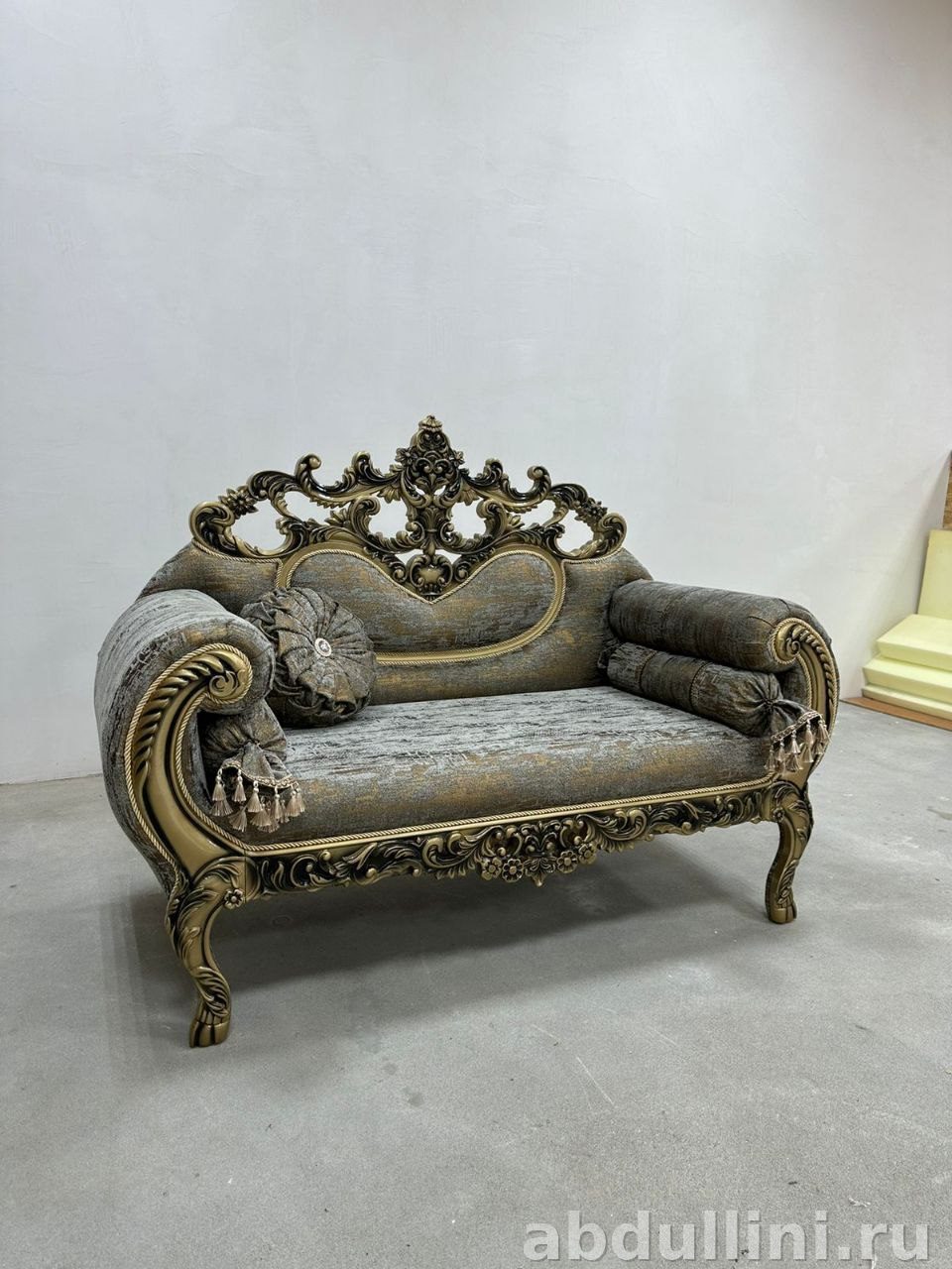 Основной цвет обивки — сложный серо-золотистый оттенок с текстурным рисунком, создающим эффект старины. Каркас и декоративные элементы выполнены в золотистом цвете с патиной, подчеркивающей витиеватые узоры. Обивка — плотная жаккардовая ткань, наполнитель — пенополиуретан высокой плотности для долговечности и комфорта.