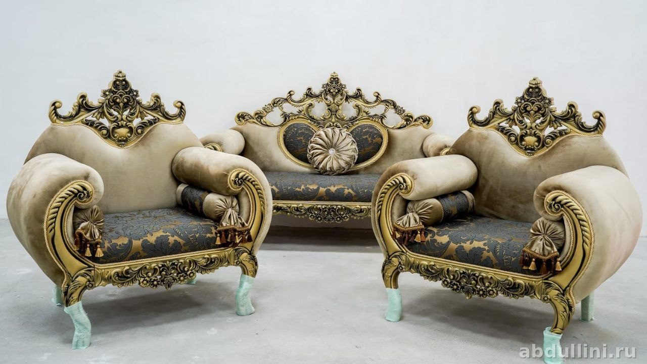 Комплект из трехместной банкетки и двух кресел в восточном стиле. Каркас — золотистый с глянцевым блеском, резные узоры, ножки бирюзовые. Обивка — бежевая матовая ткань, сиденья и спинки украшены жаккардовым узором с золотом.