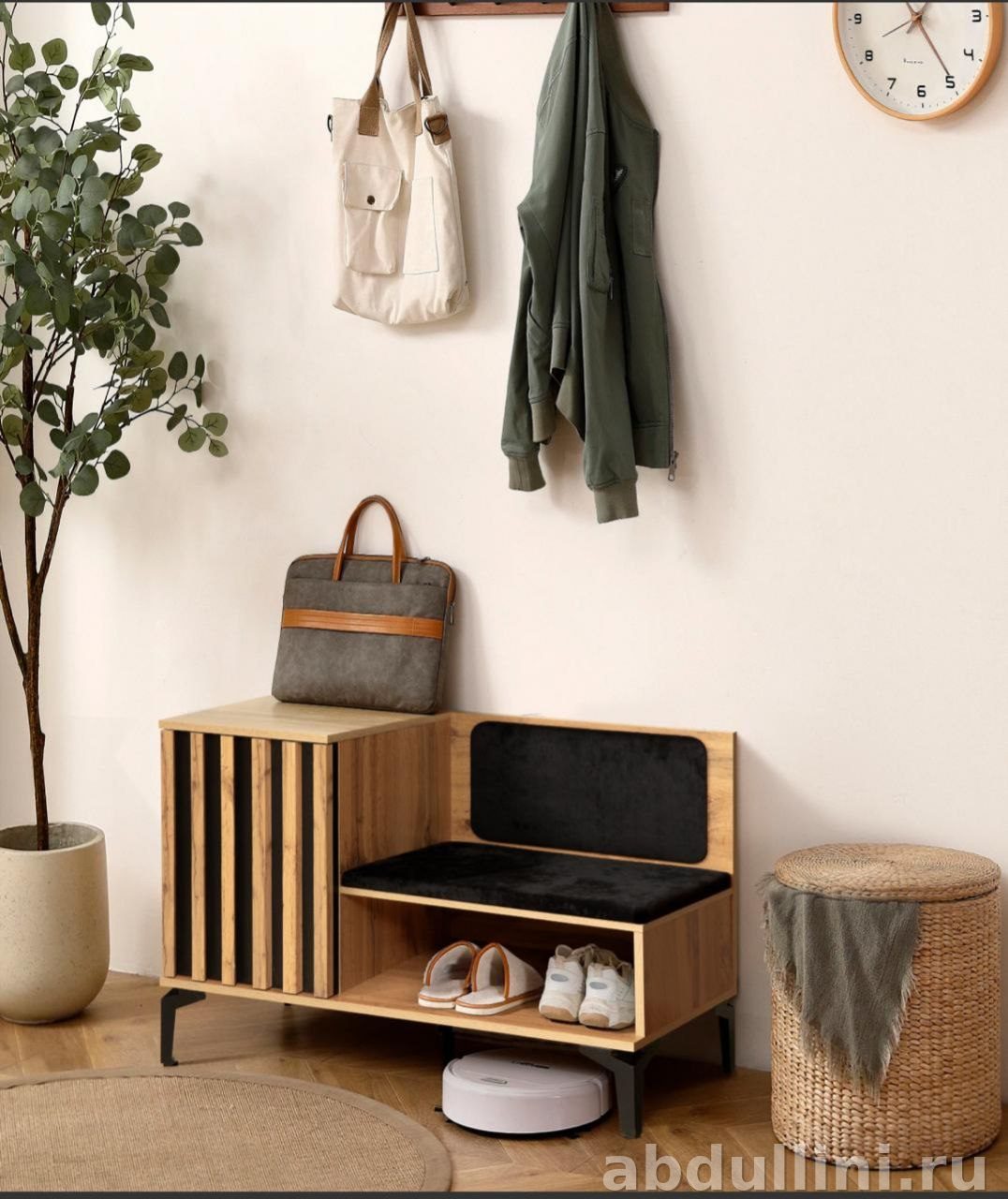 удобная и компактная мебель для прихожей. Сочетает удобное сиденье, открытую полку для обуви и закрытый шкафчик с реечной дверцей. Идеально подходит для небольших пространств.
