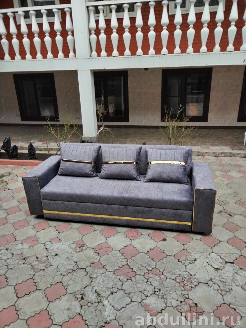 В комплект входят три подушки спинки с вертикальной прострочкой, создающей эффект разделения на секции. Декоративные золотистые элементы по периметру и на подушках добавляют изысканности и придают дивану модный вид с элементами неоклассики.