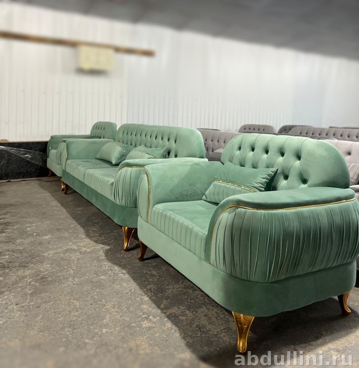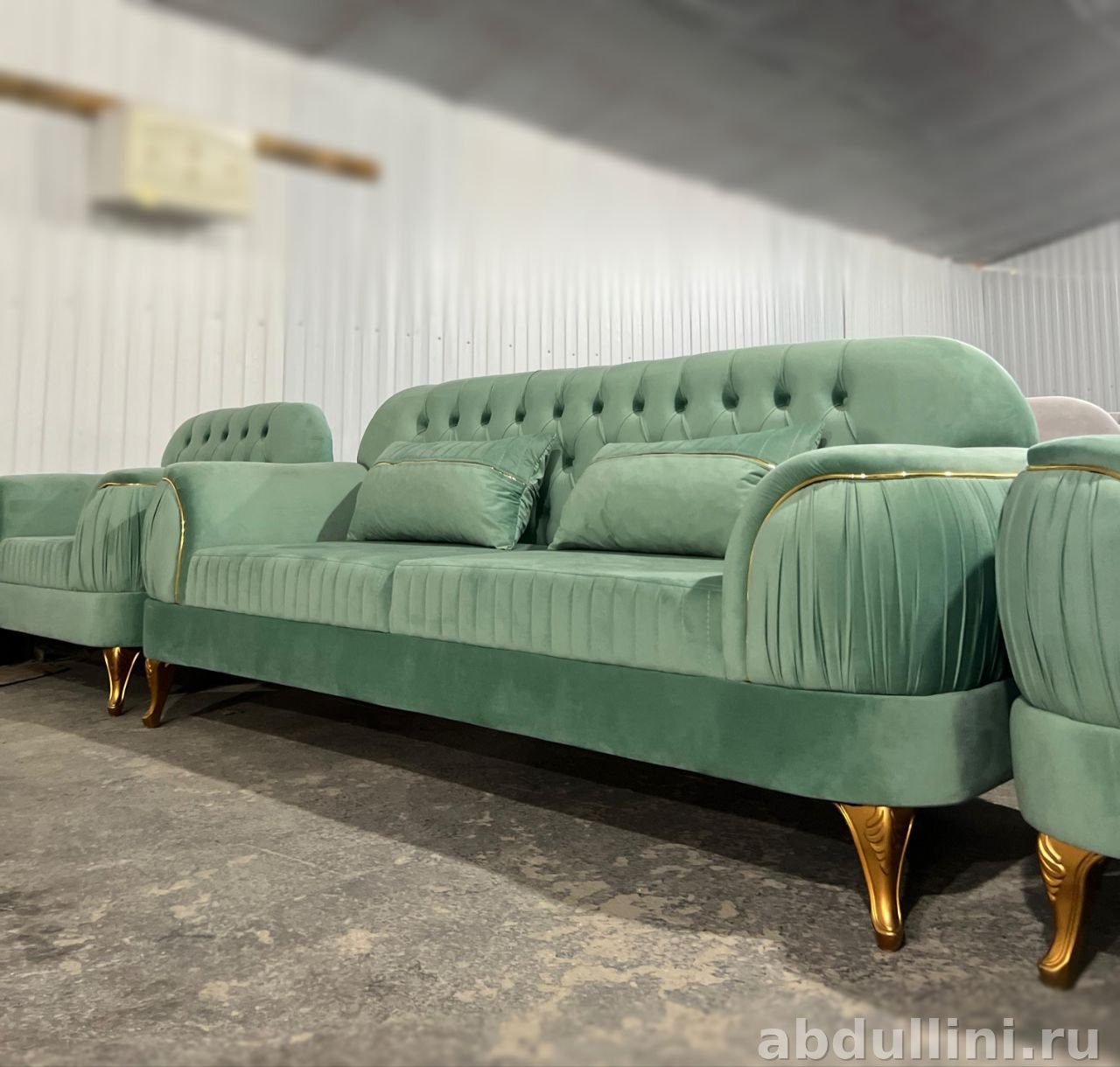 Комплект мягкой мебели в стиле неоклассики с элементами гламура. Включает трехместный диван и два кресла. Цвет обивки — приглушенный зеленый с бархатистой текстурой, напоминающий фисташку или мяту. Декоративная золотистая окантовка подчеркивает контуры подлокотников и спинки. Спинки украшены стяжкой в виде ромбов («капитоне»), что добавляет изысканности дизайну.