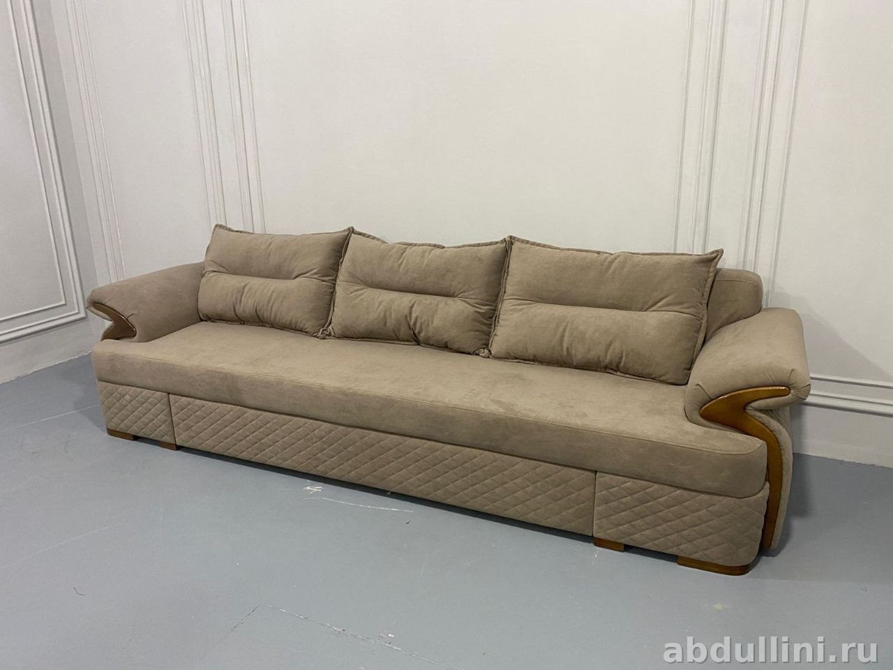 - Конструкция: мягкие подлокотники, три отдельные подушки спинки, ромбовидная прострочка