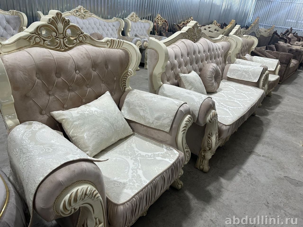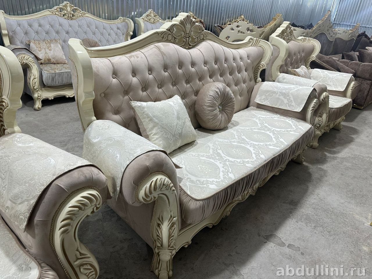 Диван «Фараон» 802 — это стильное и удобное решение для вашего интерьера. Комплект выполнен в классическом стиле с элементами барокко, что делает его универсальным для разных типов помещений. Основной цвет обивки — приглушенный бежевый с легким розоватым подтоном, который сочетается с кремовыми декоративными элементами и золотистой патиной. Такой диван станет акцентом в вашей гостиной или зале.