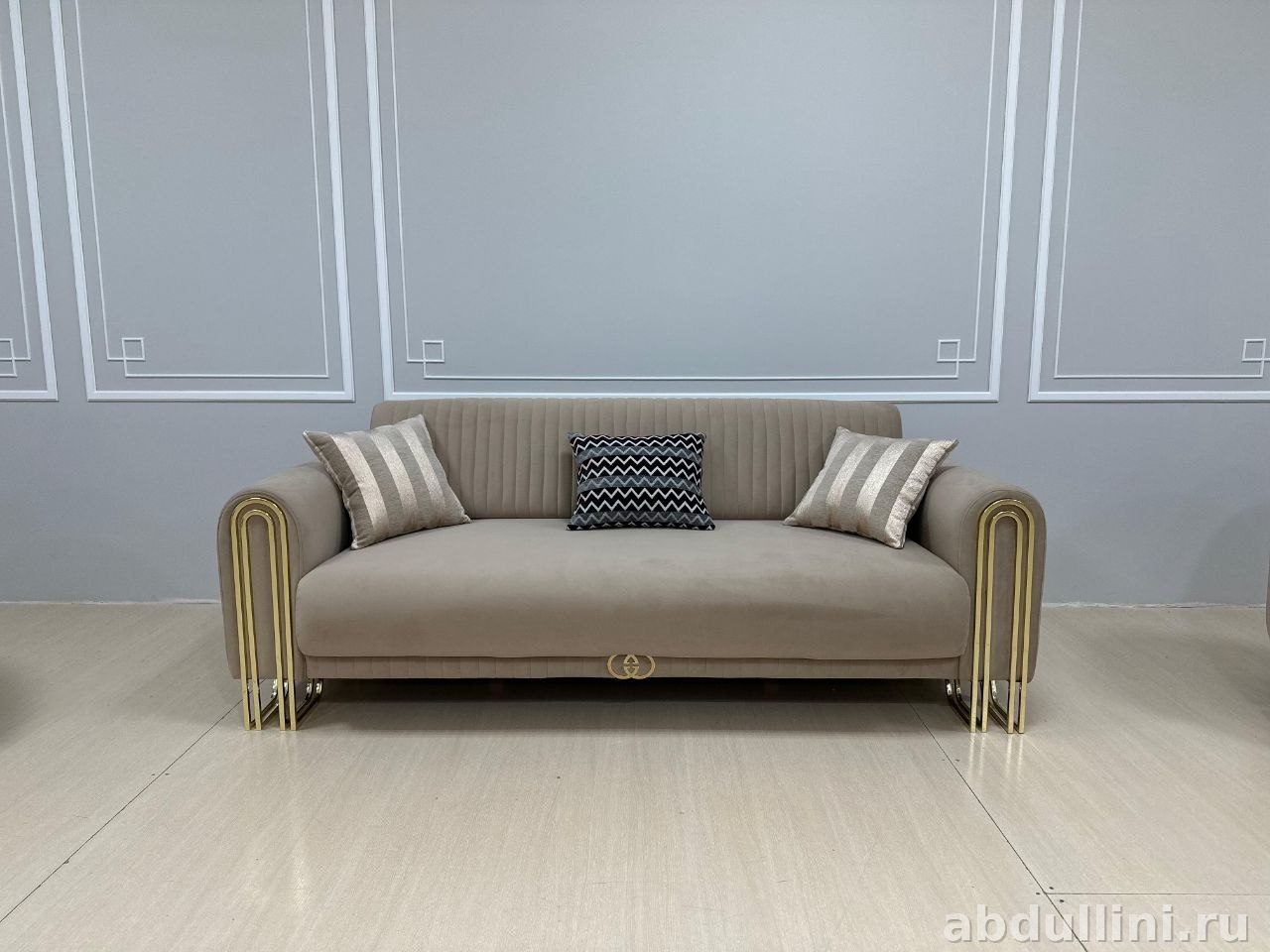 Комплект: диван + 3 декоративные подушки. Обивка — мягкий велюр бежевого цвета с вертикальной прострочкой на спинке. Каркас — дерево/ДСП, металлические вставки золотистого оттенка на подлокотниках и основании.