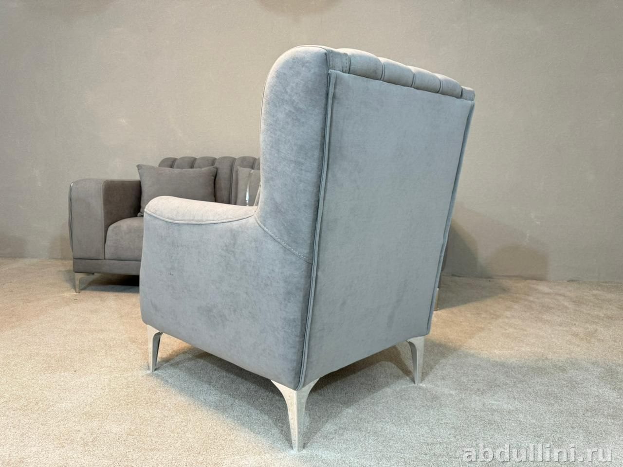 - Конструкция: диван с вертикальной прострочкой на спинке, декоративные складки на боковинах, подлокотники с серебристой отделкой. Кресла с высокой спинкой, мягкими подлокотниками и металлическими ножками.