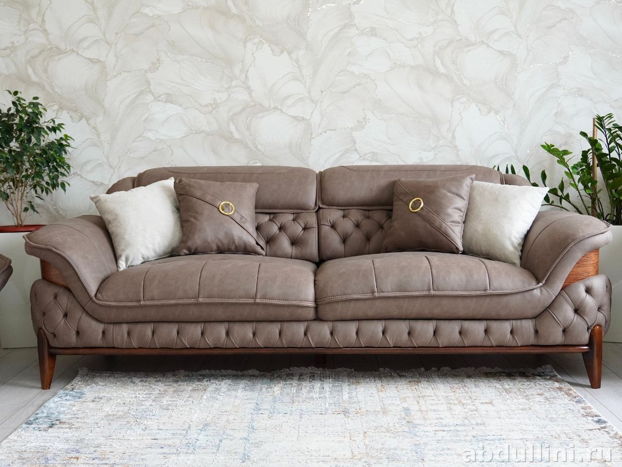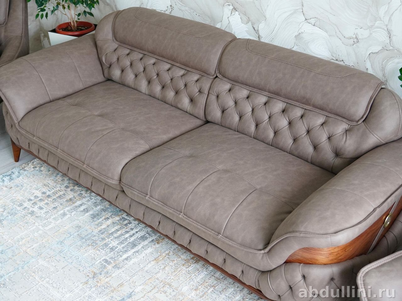 Цвет обивки — приглушенный серо-коричневый, напоминающий оттенок мокко. Матовая отделка с текстурой, имитирующей кожу, добавляет мебели изысканности. Декоративная стяжка «капитоне» на диване и креслах создает эффект классической роскоши. Деревянные детали выполнены в теплом оттенке натурального дерева, с матовым покрытием, что придает мебели завершенный вид.