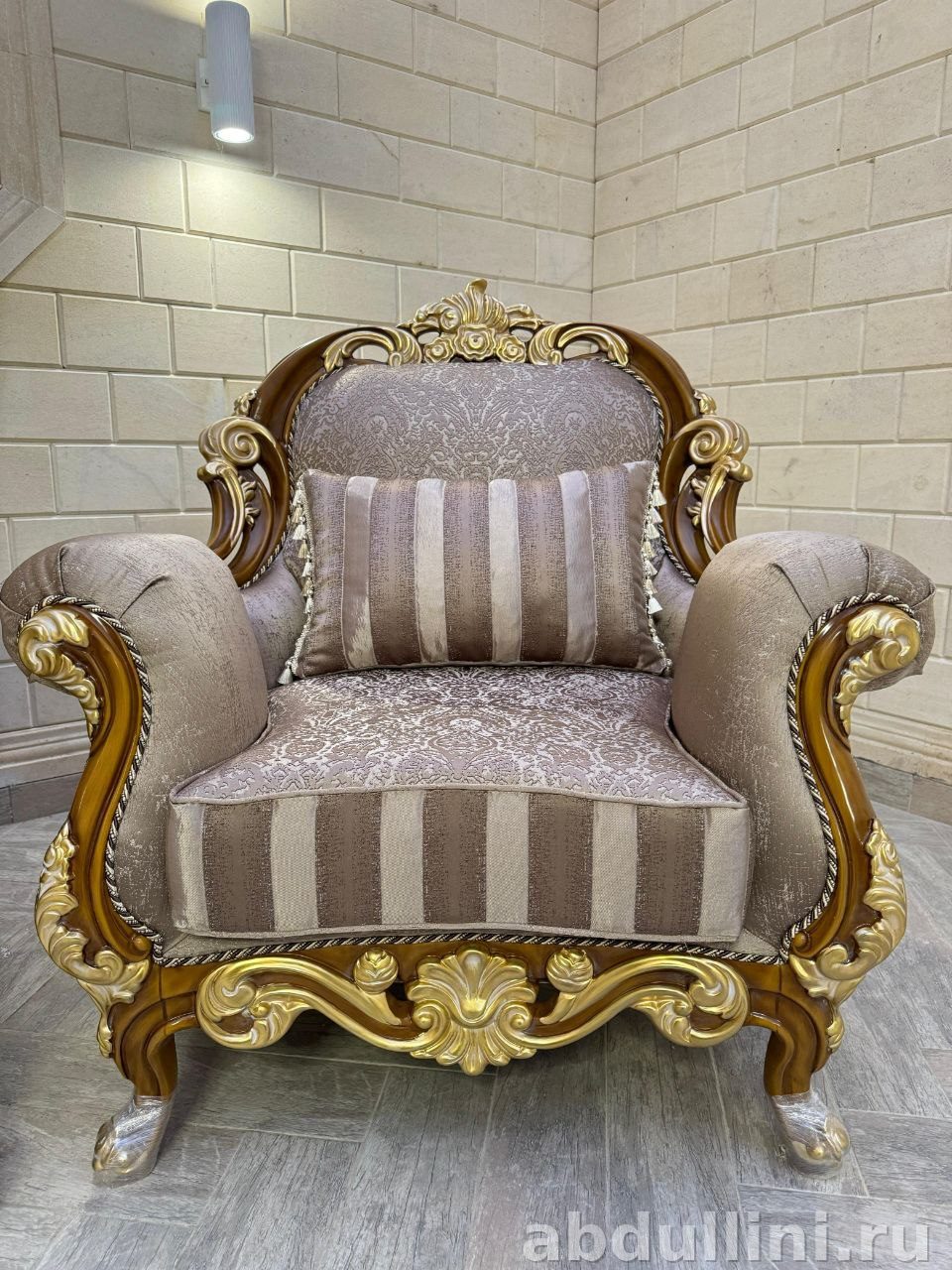 Комплект состоит из трехместного дивана и двух кресел. Основные цвета — приглушенный бежевый, какао с молоком и золотистый. Обивка ткани сочетает однотонные участки, полосы и жаккардовый узор с растительными мотивами. Деревянные элементы с резьбой и глянцевой золотистой отделкой добавляют изысканности.