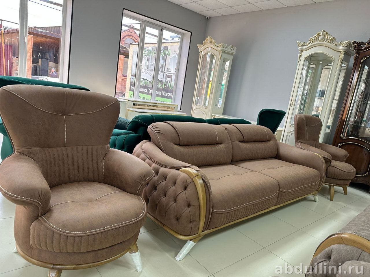 модный мебельный комплект из дивана и двух кресел. Произведен в Ставрополе, доступен для заказа в Дагестане. В комплект входит двухместный диван и два кресла, выполненные в едином стиле и цветовой гамме.
