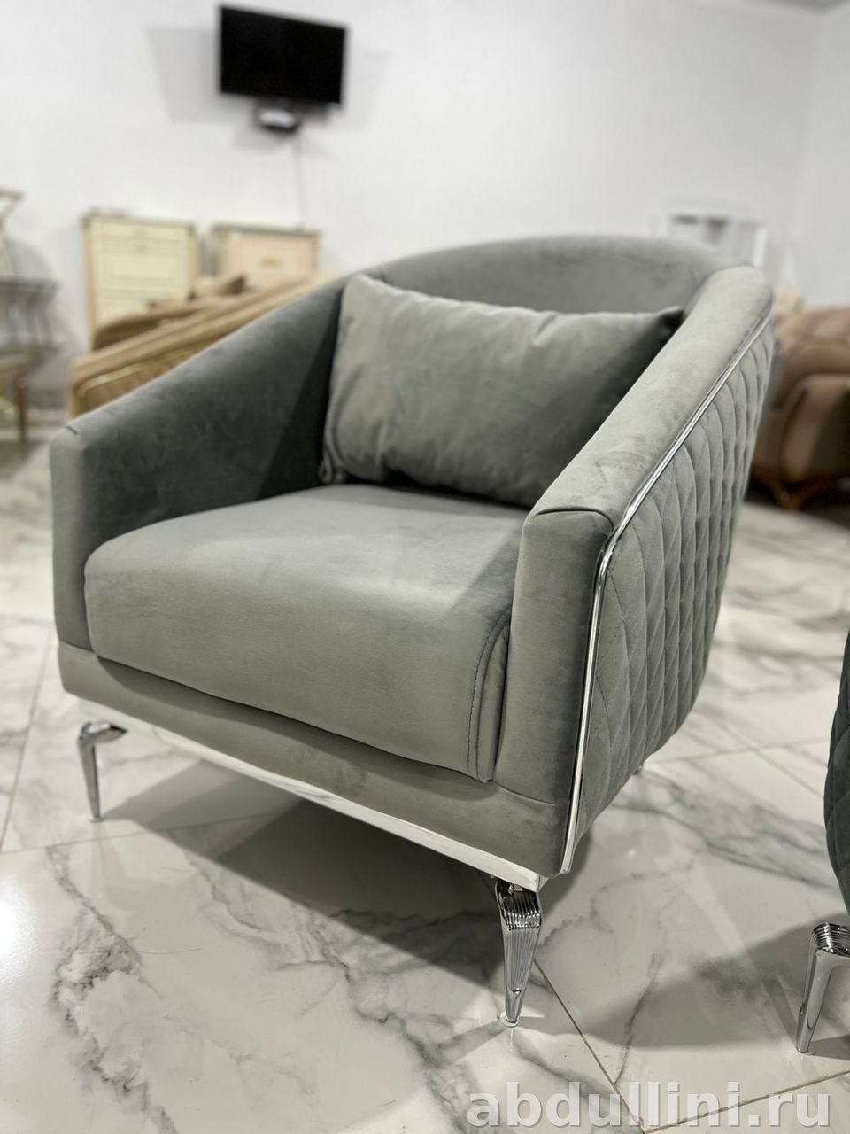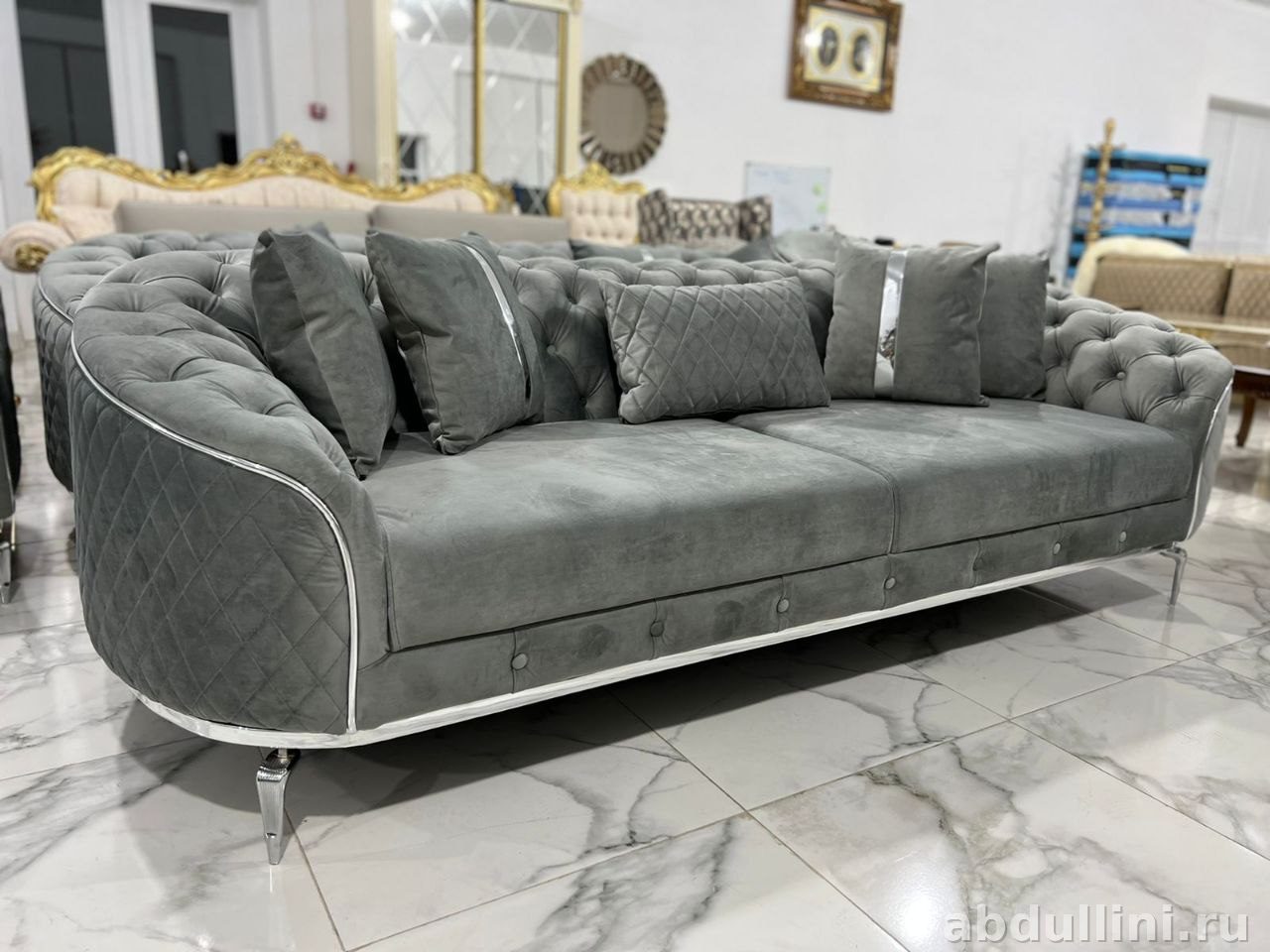 Комплект из трехместного дивана и двух кресел в приглушенном сером цвете с серебристой отделкой. Мебель выполнена в стиле неоклассика с элементами гламура. Обивка — мягкий велюр с матовой текстурой, каркас из дерева, ножки хромированные. Диван и кресла имеют стеганую ромбовидную отделку и декоративные пуговицы в тон. Идеально подойдет для гостиной или зоны отдыха.