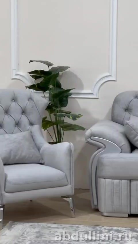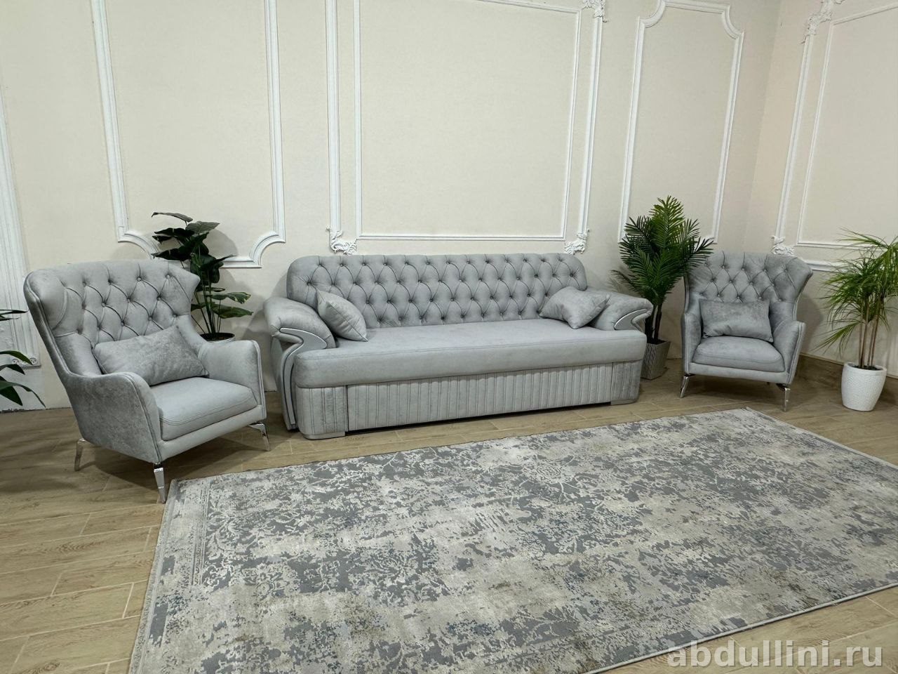 Комплект из трехместного дивана и двух кресел в стиле неоклассика с элементами гламура. Обивка — матовый светло-серый велюр с бархатистой текстурой. Спинки украшены глубокой ромбовидной стяжкой (капитоне).