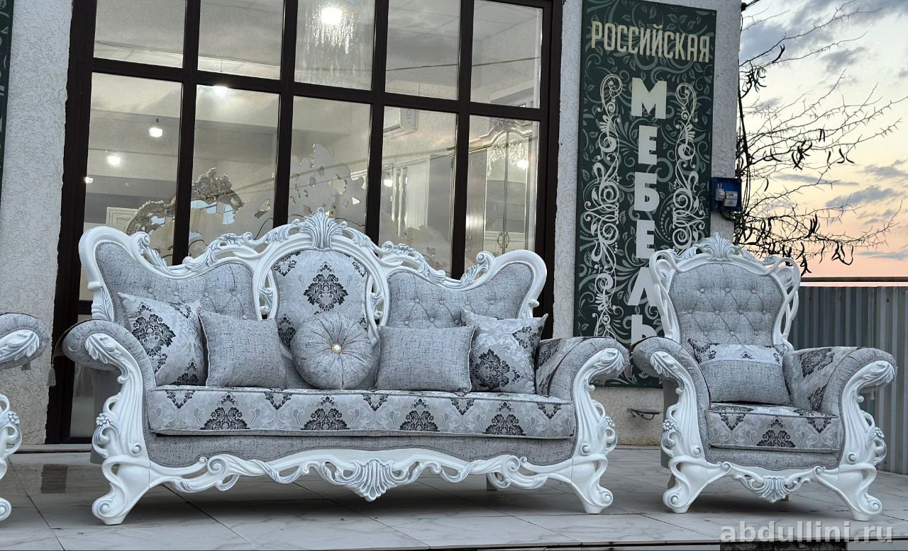 Комплект из дивана и двух кресел с резным каркасом и тканевой обивкой. Подойдет для гостиной в классическом стиле.