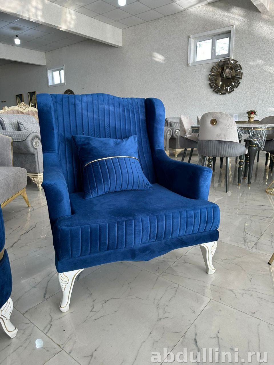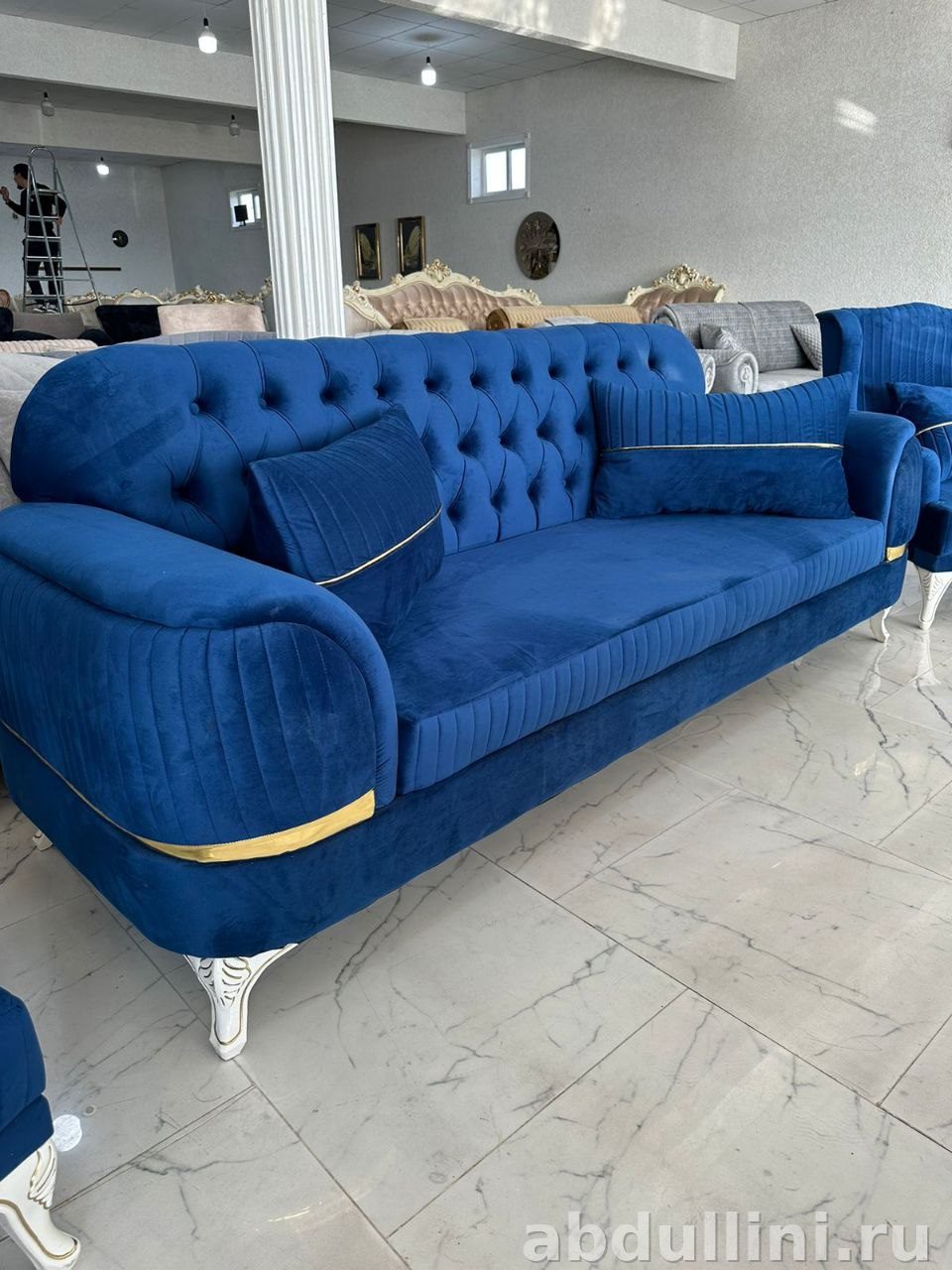 Набор из трехместного дивана и двух кресел в стиле неоклассика с элементами гламура. Идеально подходит для создания уютной и стильной гостиной. Основной цвет обивки — насыщенный синий, близкий к сапфировому, с тонкой золотистой полосой, подчеркивающей контуры подлокотников и подушек.