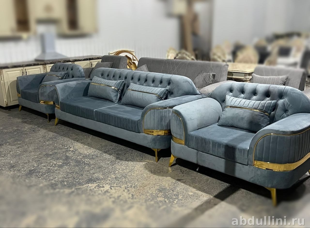 Комплект мягкой мебели Манго включает трехместный диван и два кресла. Мебель выполнена в серо-голубом оттенке, напоминающем морскую волну, с матовой бархатистой текстурой. Золотистые вставки обрамляют подлокотники и нижнюю часть, добавляя изысканности.