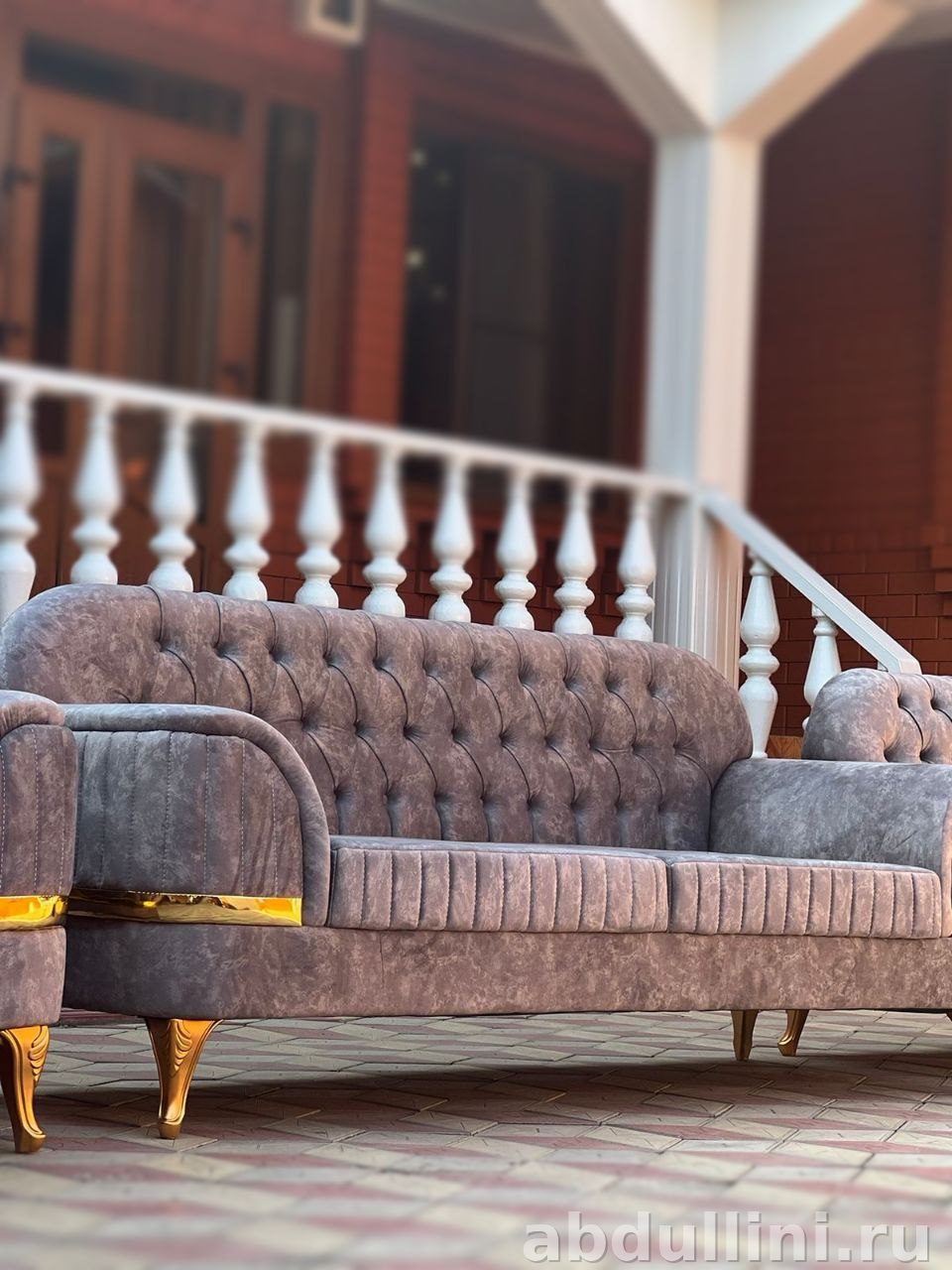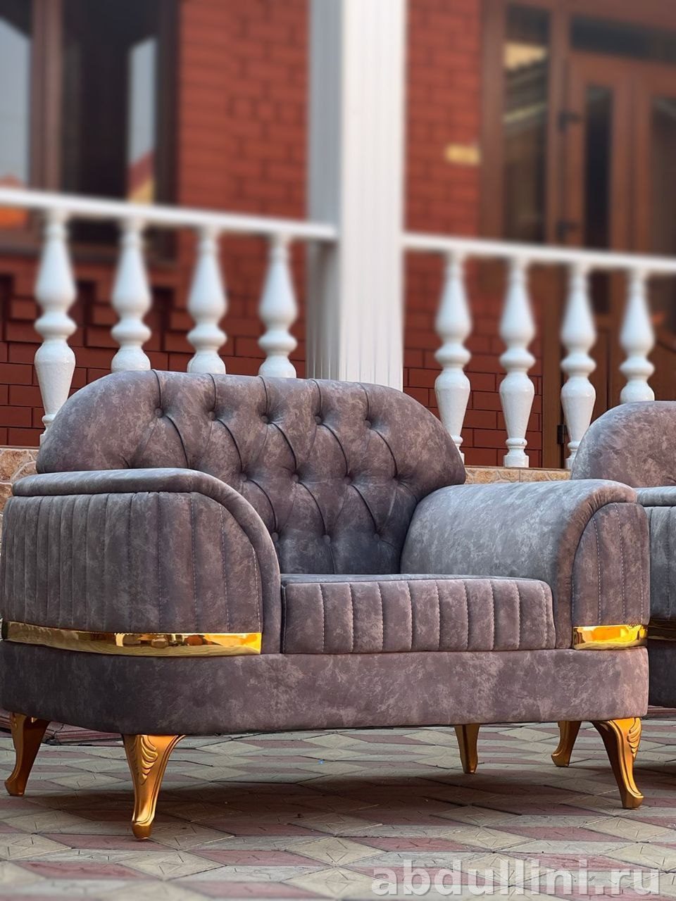 Комплект из дивана и двух кресел в приглушенном серо-лиловом оттенке с бархатистой текстурой. Золотистые металлические вставки и ножки добавляют изысканности, а капитоне на спинках создает объем.