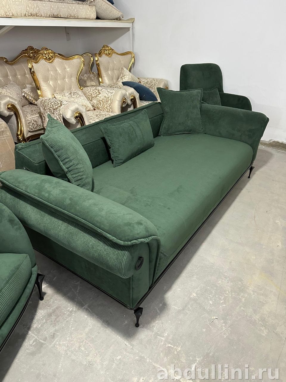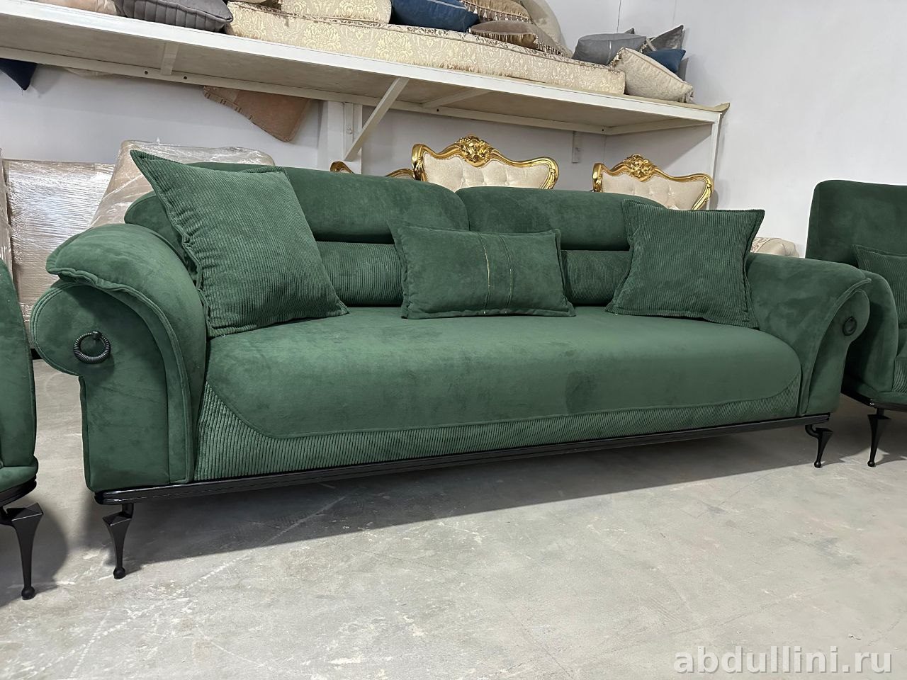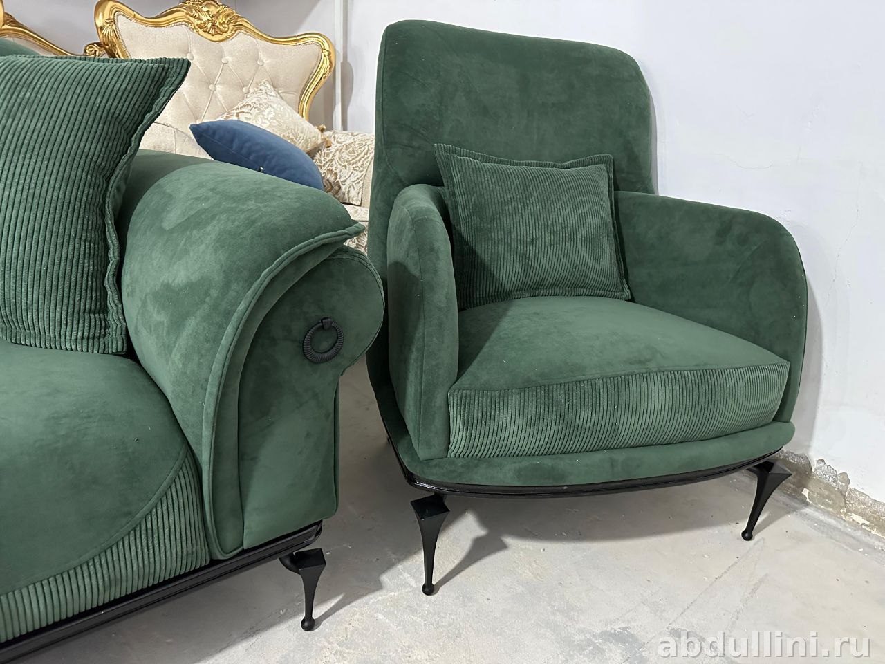 Комплект мягкой мебели «Марокко» — модный выбор для вашего дома. Включает трёхместный диван и два кресла, выполненных в едином стиле с элементами неоклассики. Основной цвет обивки — насыщенный тёмно-зелёный, напоминающий изумруд или тёмную хвою. Ткань с вельветовой текстурой добавляет тактильности и визуального интереса.