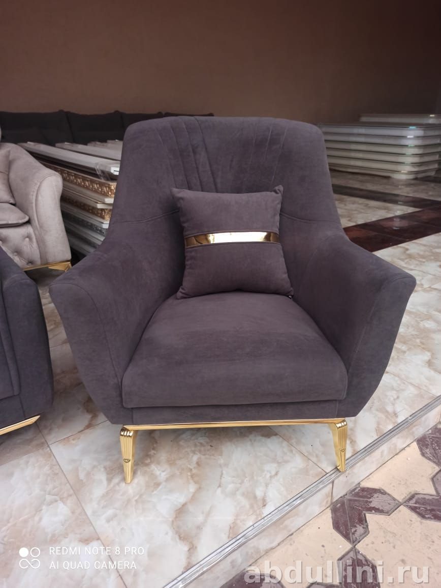 Комплект мягкой мебели в современном стиле с элементами декора. Включает трехместный диван и два кресла. Основной цвет обивки — приглушенный серо-фиолетовый, напоминающий дымчатый аметист. Ткань с матовой бархатистой текстурой приятна на ощупь и добавляет уюта.