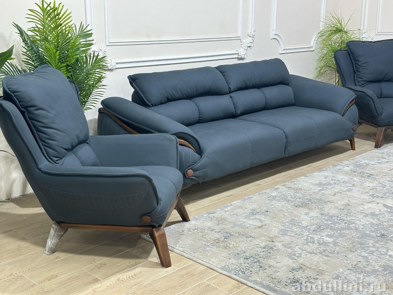 Представляем новый комплект мягкой мебели Puma. Это стильное решение для вашего дома, сочетающее в себе модный дизайн и удобство. Комплект включает трехместный диван и два кресла, выполненные в глубоком темно-синем цвете, напоминающем морскую волну. Матовая текстура ткани добавляет изысканности, а деревянные вставки теплого коричневого оттенка подчеркивают элегантность мебели.