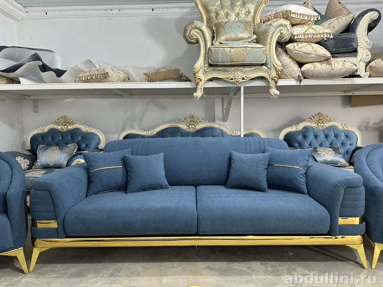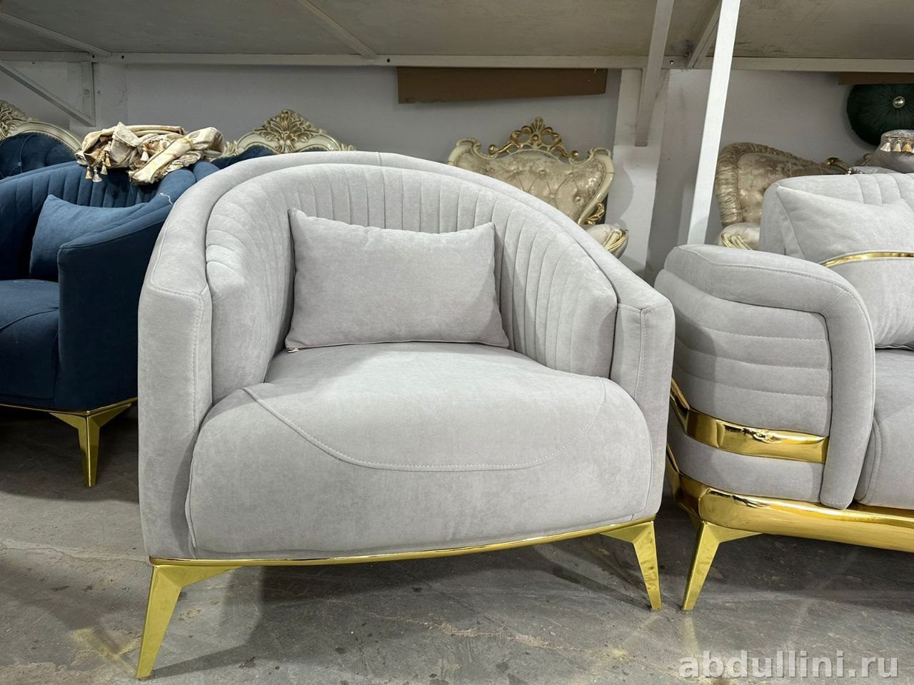 Обивка выполнена в светло-сером цвете с матовой текстурой. Декоративные элементы — золотистые металлические вставки по периметру и подлокотникам. Вертикальная прострочка на спинках и подлокотниках добавляет стиля. В комплект входит 6 декоративных подушек в тон обивке.