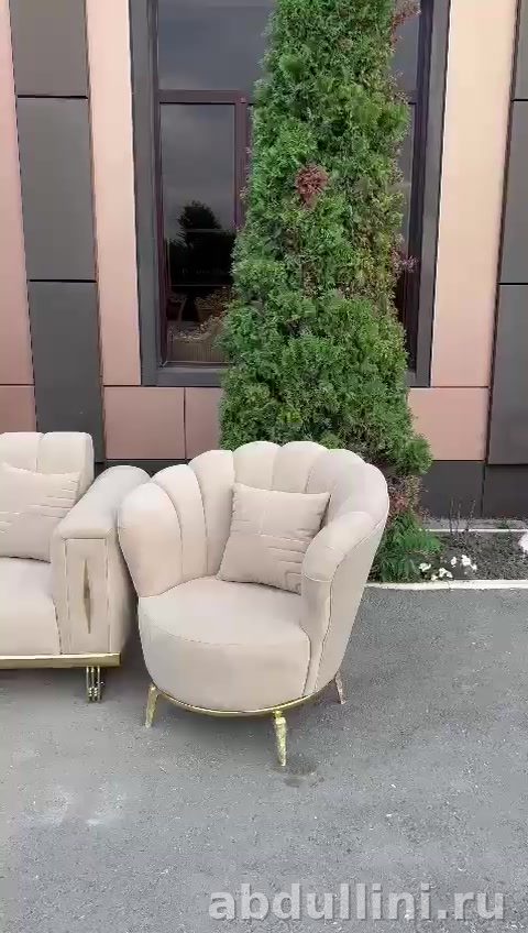 Комплект подходит для небольших помещений благодаря компактным размерам кресел. Возможен повтор модели в других цветах и размерах. Мебель выполнена из качественных материалов: каркас из дерева или фанеры, металлические элементы с золотистым покрытием.