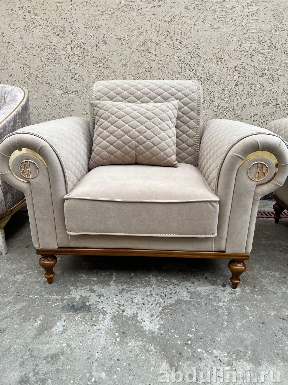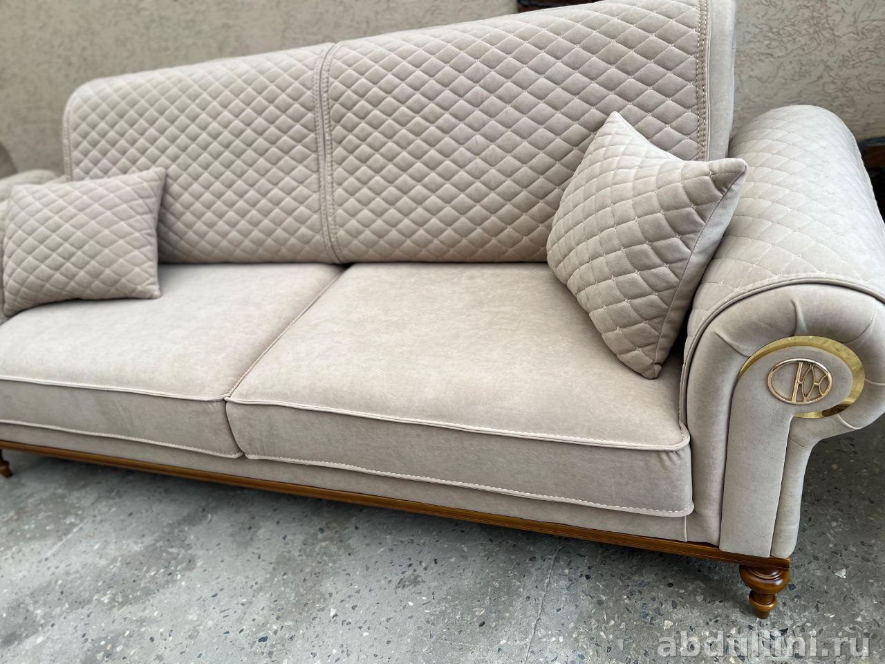 Комплект включает двухместный диван и кресло в стиле неоклассика с элементами ар-деко. Обивка светло-бежевого цвета, матовая, мягкая на ощупь, предположительно велюр. Диван и кресло украшены ромбовидной стяжкой (капитоне) на спинках и подушках, что добавляет им элегантности. Подлокотники дополнены золотистыми декоративными элементами. По нижнему краю проходит тонкая деревянная планка.
