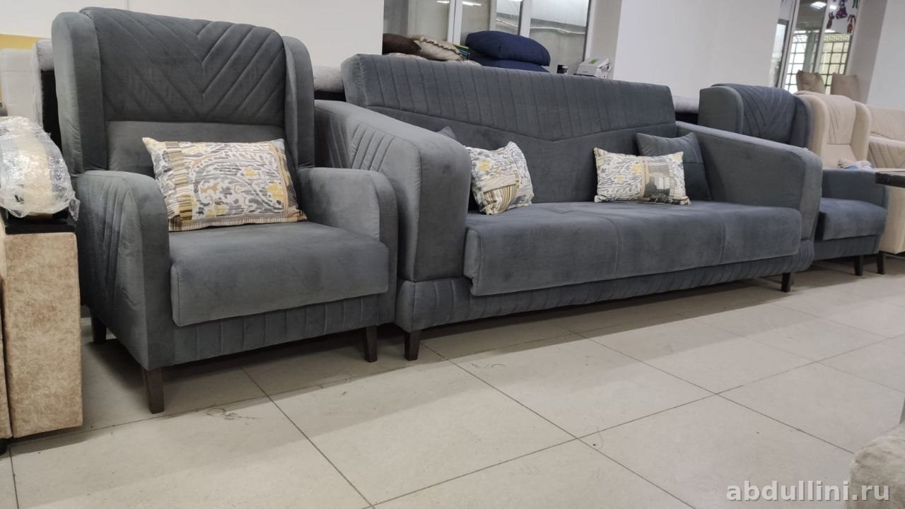 Комплект из трёхместного дивана и кресла в современном стиле. Обивка — плотный велюр с матовой фактурой, приятный на ощупь. Цвета: светлый беж или насыщенный графит (на выбор).