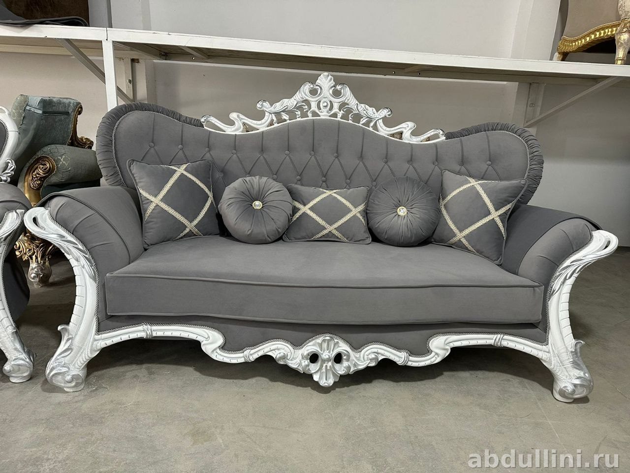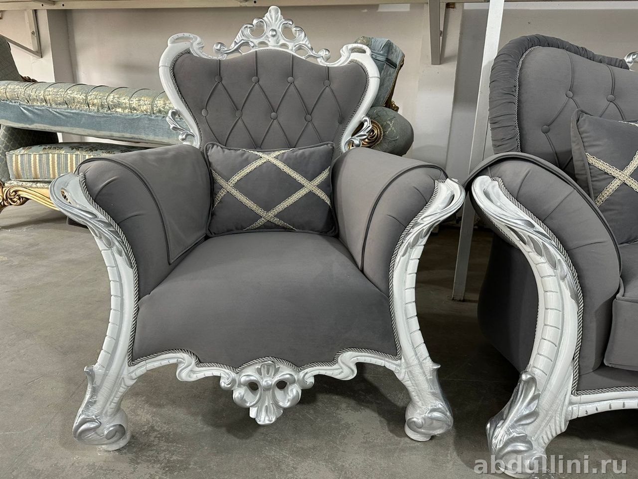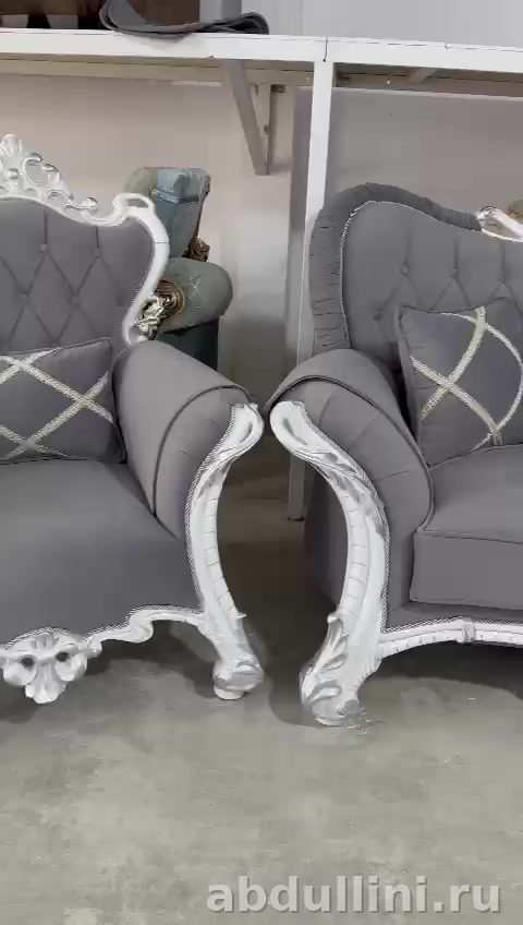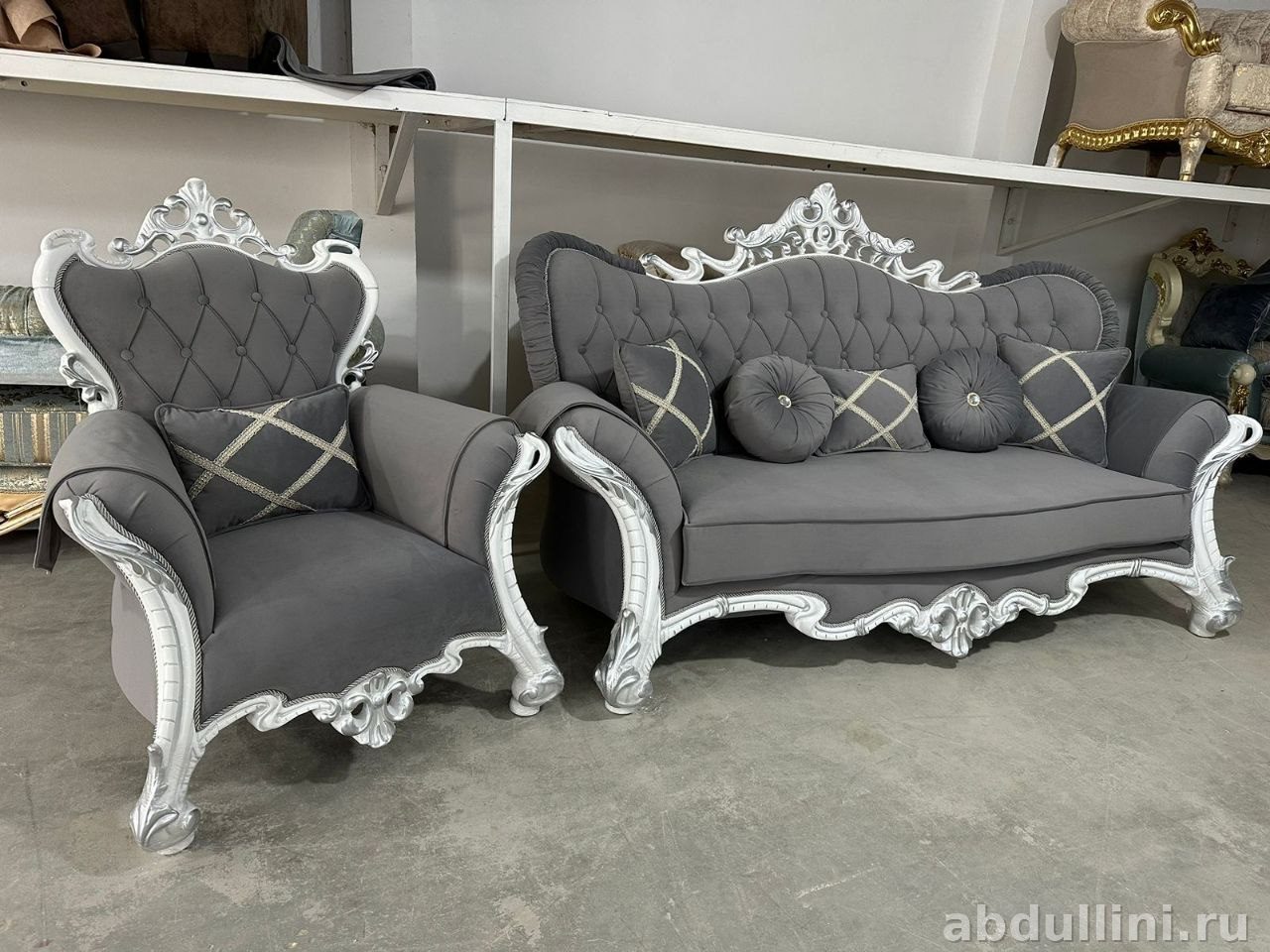 Комплект из двухместного дивана и кресла в стиле барокко. Подойдет для гостиной или кабинета. Основной цвет обивки — насыщенный серый с графитовым подтоном, каркас отделан серебристым глянцевым покрытием. Резной орнамент и капитоне добавляют изысканности.
