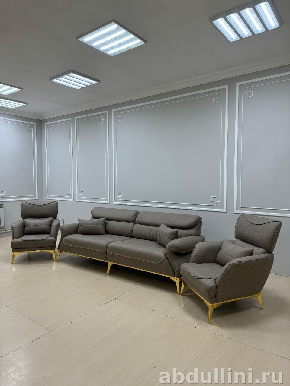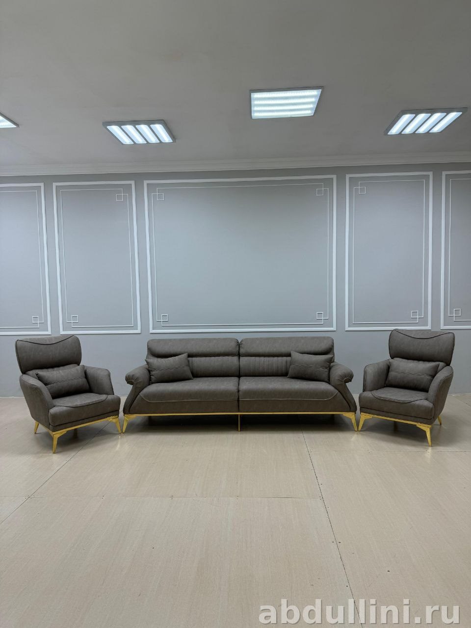 Комплект из дивана и двух кресел в стиле неоклассика. Обивка — серо-коричневая ткань или экокожа, матовая, без глянца. Каркас деревянный, ножки металлические с золотистым покрытием. Наполнитель — упругий пенополиуретан для комфортного отдыха.