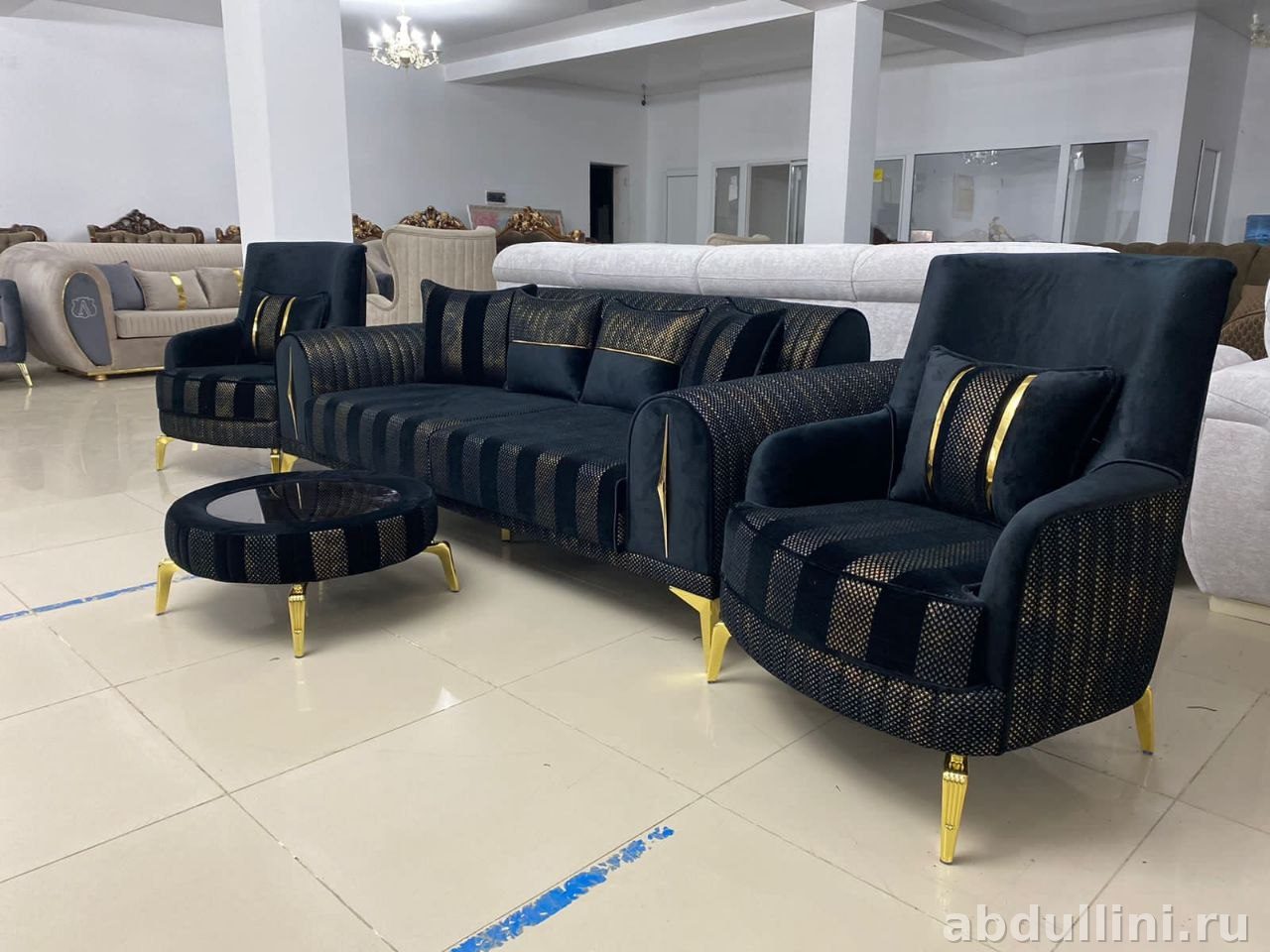 Прямой трёхместный диван с мягкими подлокотниками и кресло с высокой спинкой. Чёрная обивка с золотистыми геометрическими узорами, металлические ножки с золотистым покрытием.