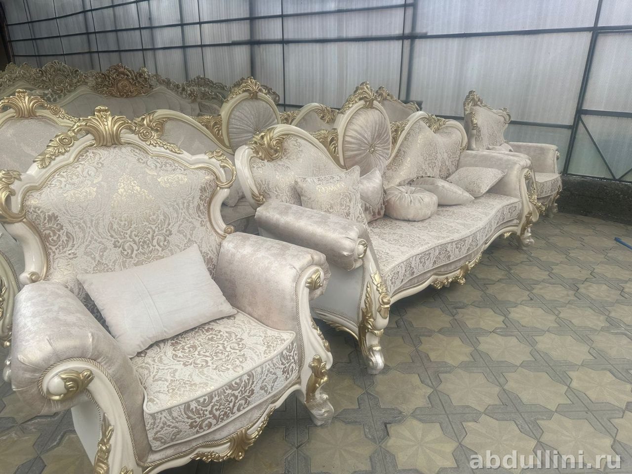 - Особенности: мягкие подлокотники, высокая спинка, изогнутые резные ножки с золотой отделкой.