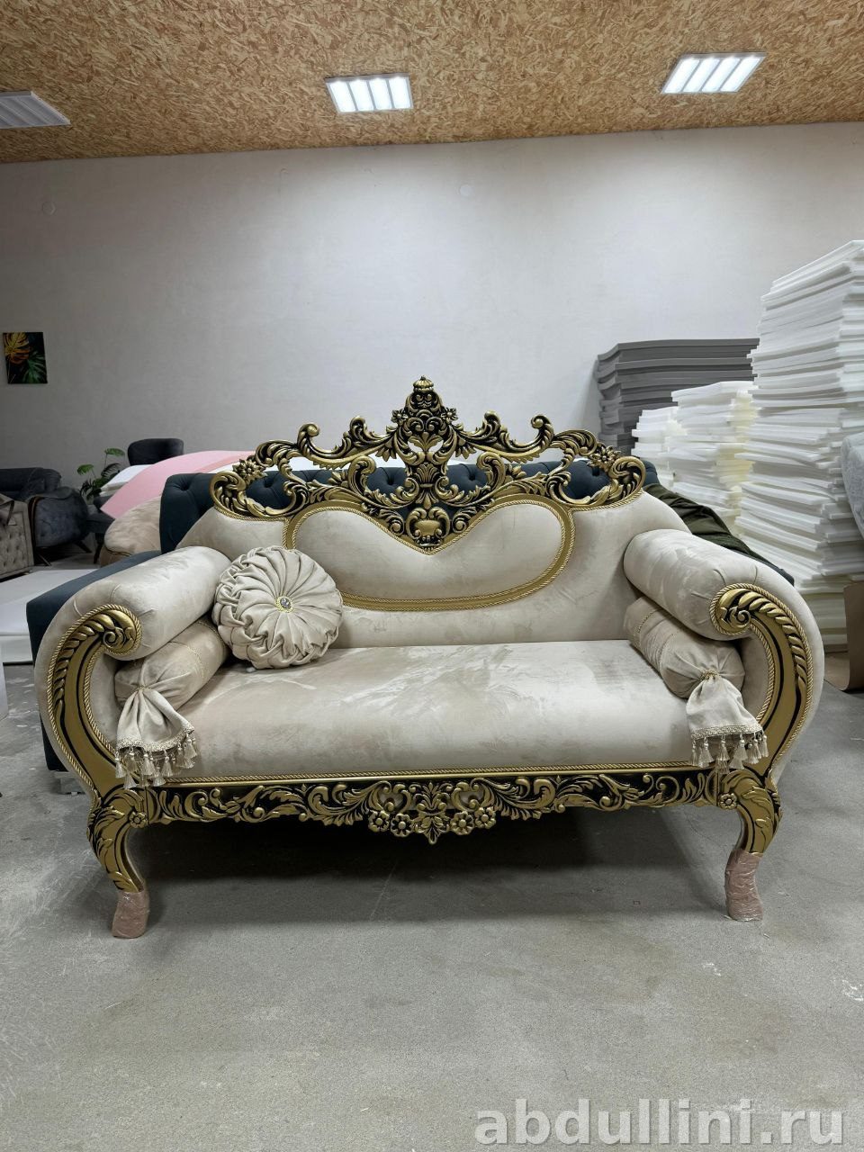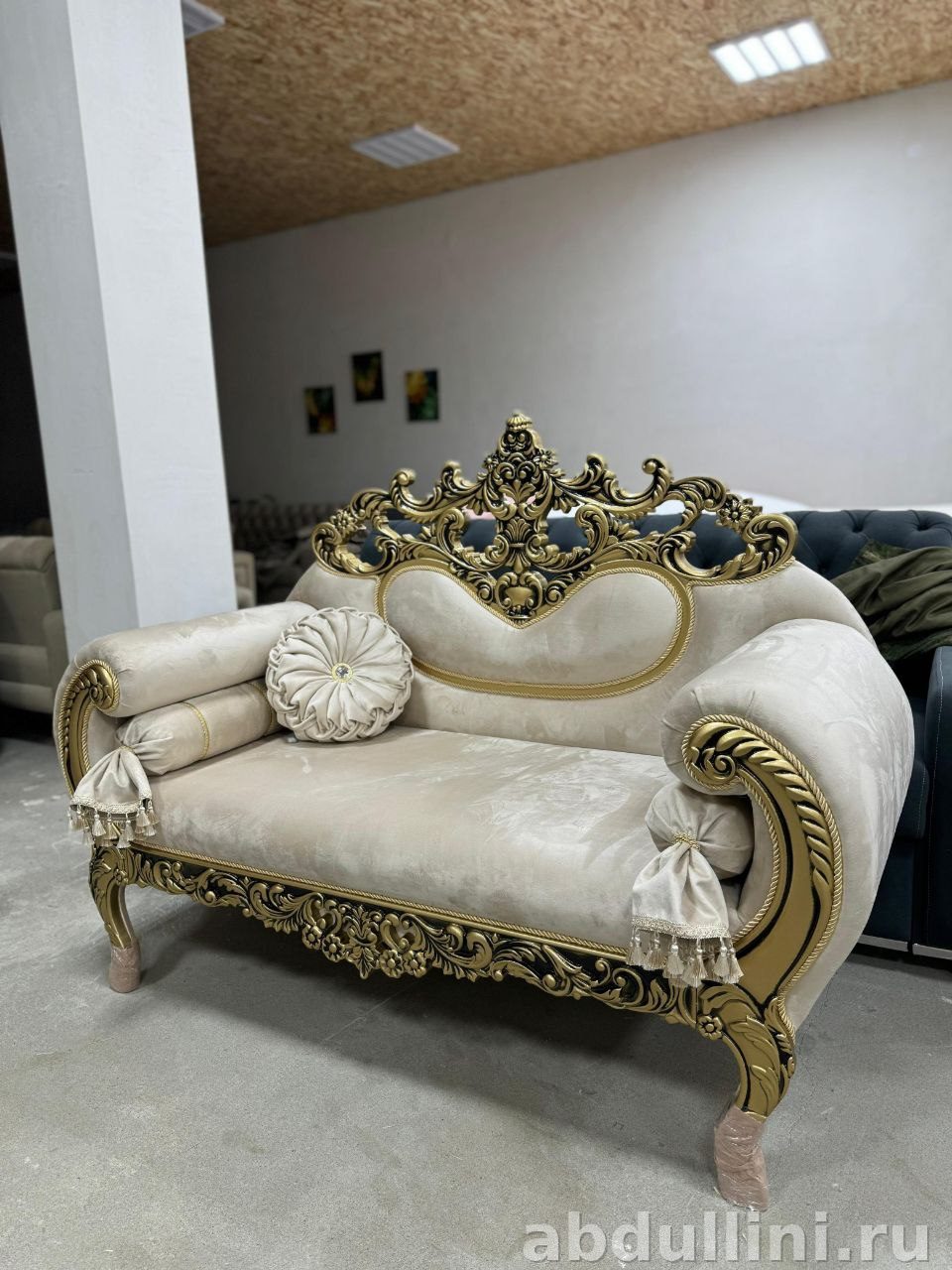 - Конструкция: низкая посадка, мягкие подлокотники с валиками, короткие изогнутые ножки с золотистой отделкой.