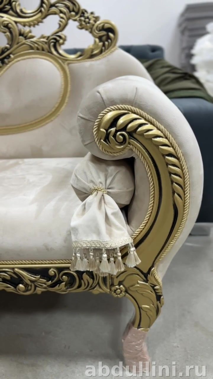 Обивка выполнена в кремовом цвете с легким перламутровым отливом, создающим эффект мягкого сияния. Каркас декорирован золотистыми элементами с чернением, подчеркивающими изысканность форм. Подлокотники украшены валиками с кисточками, а в комплекте идет круглая декоративная подушка с драпировкой.
