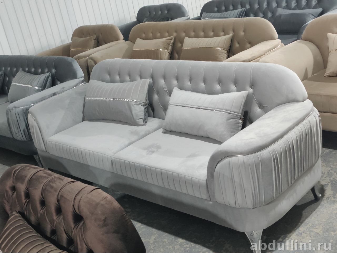 Диван Манго 3628 — стильное решение для современного интерьера. В комплект входит сам диван и две декоративные подушки. Обивка выполнена из мягкой велюровой ткани светло-серого оттенка с матовым блеском. Подлокотники украшены вертикальной драпировкой, создающей эффект плиссировки. Спинка декорирована прошивкой в виде ромбов, что добавляет изысканности.