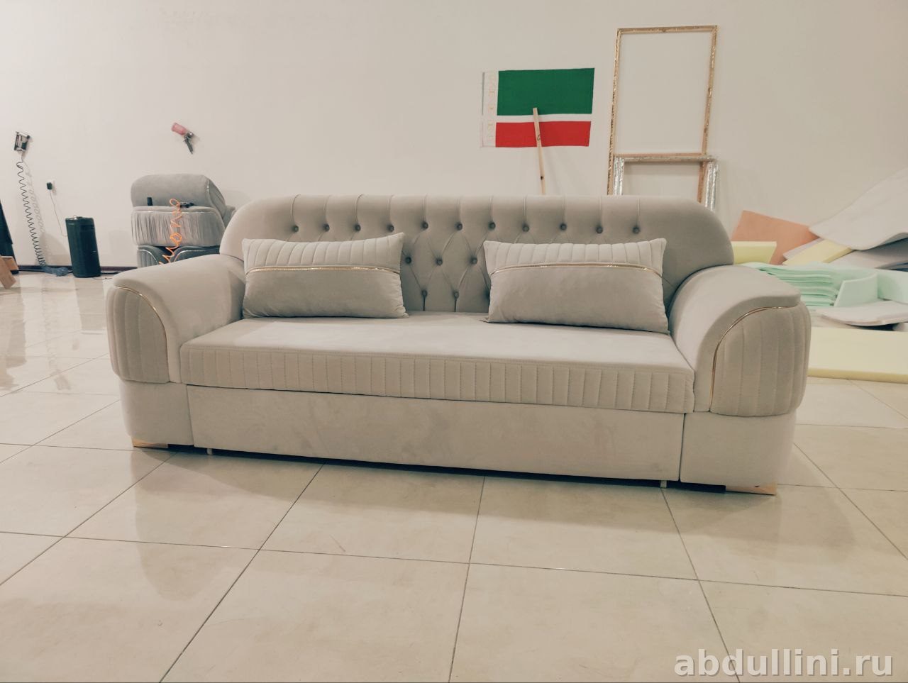 Цвет дивана — светло-серый с бежевым подтоном, оттенок напоминает слоновую кость или кремовый. Обивка выполнена из мягкого велюра или микровелюра, приятного на ощупь. Декоративные элементы включают золотистую полосу по контуру подлокотников и подушек, а также стеганую спинку с пуговицами в тон обивки, что добавляет изысканности.