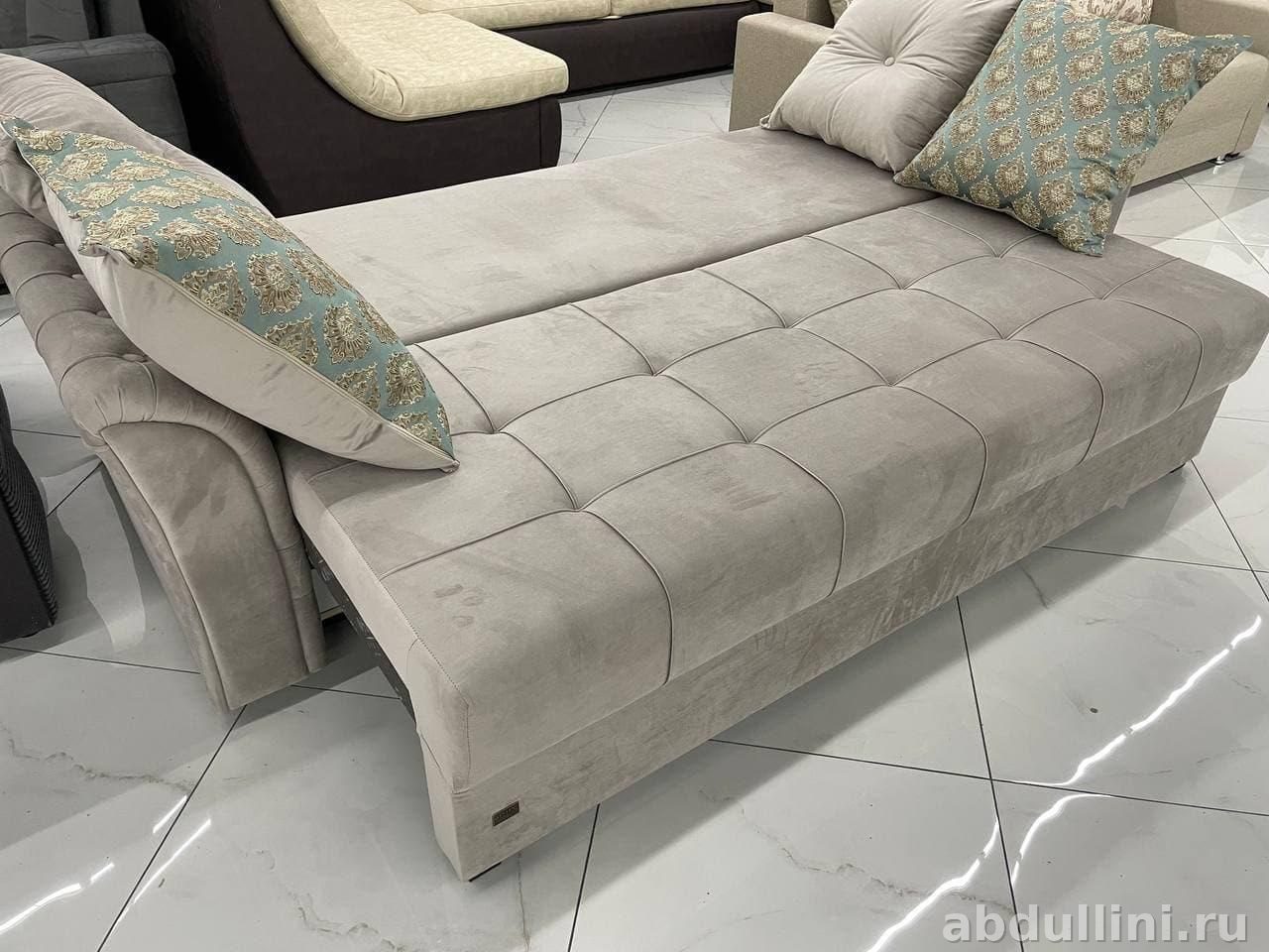 Обивка — велюр или бархат, каркас — дерево или ЛДСП, наполнитель — пенополиуретан. Механизм трансформации «Тик-так»: диван легко раскладывается в спальное место 186×140 см.