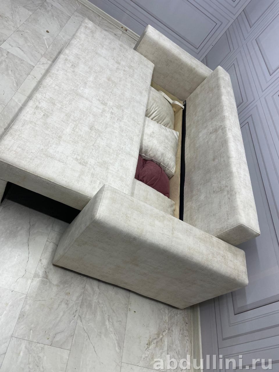 Дизайн мебели в стиле современного минимализма подчеркивает простоту и функциональность. Подъемный механизм открывает доступ к вместительному ящику для хранения, где можно разместить постельное белье, подушки или другие вещи.