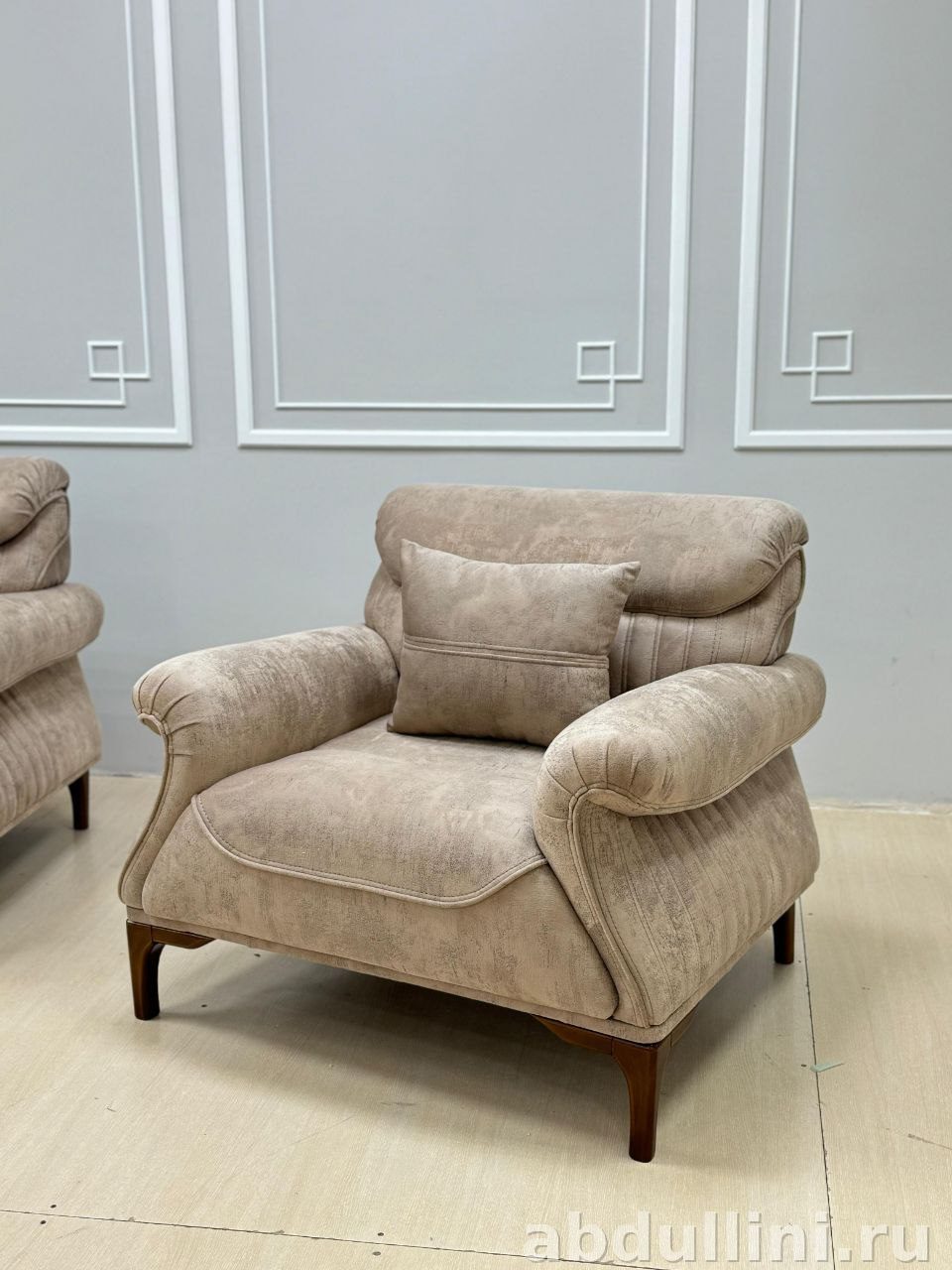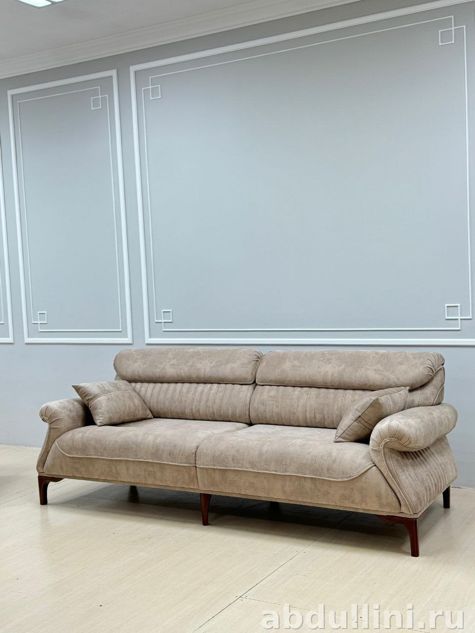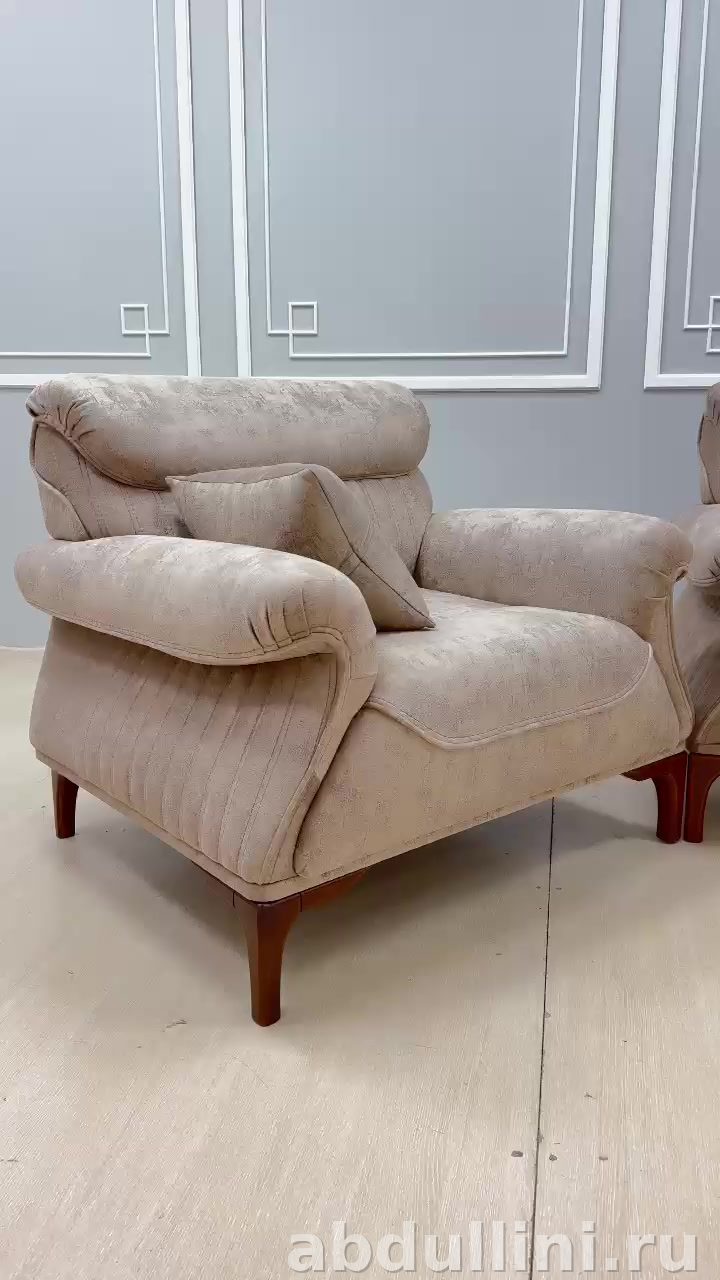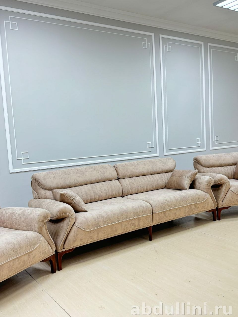 Комплект из дивана и двух кресел в стиле неоклассика с элементами модерна. Обивка — приглушенный бежевый велюр или микровельвет с матовой текстурой. Декоративная прострочка вертикальными полосами на спинках и подлокотниках, кант по контуру.