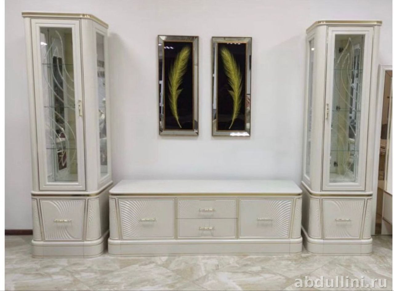 Комплект мебели для гостиной в стиле неоклассика. Светло-кремовый цвет с золотистой окантовкой создает красивый и модный образ. Волнообразный узор на фасадах и ручки с кристаллами добавляют изысканности.