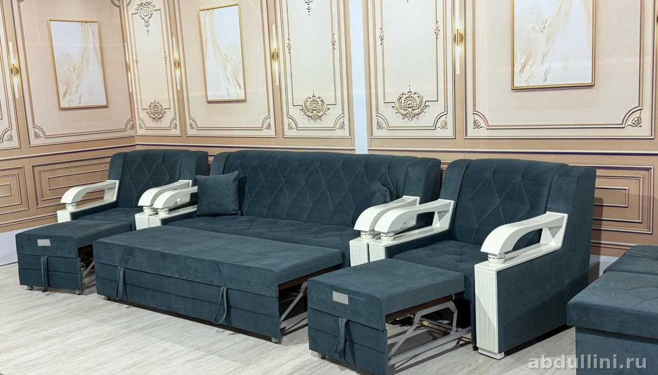 - В комплекте: диван 220 см, 2 кресла по 95 см, 2 пуфа с ящиками