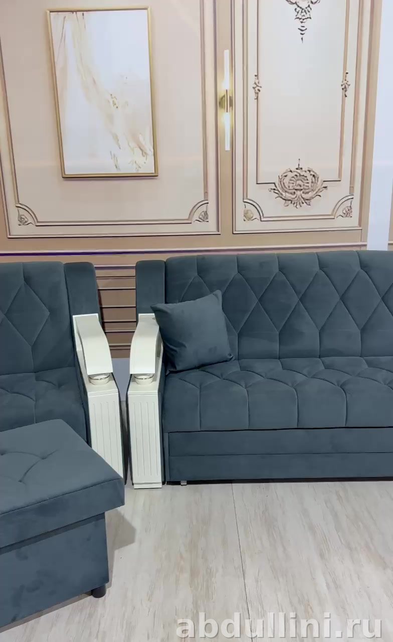 Комплект из дивана и двух кресел в стиле неоклассика с элементами модерна. Обивка — плотный велюр графитового цвета с ромбовидной стяжкой. Подлокотники из светлого дерева.