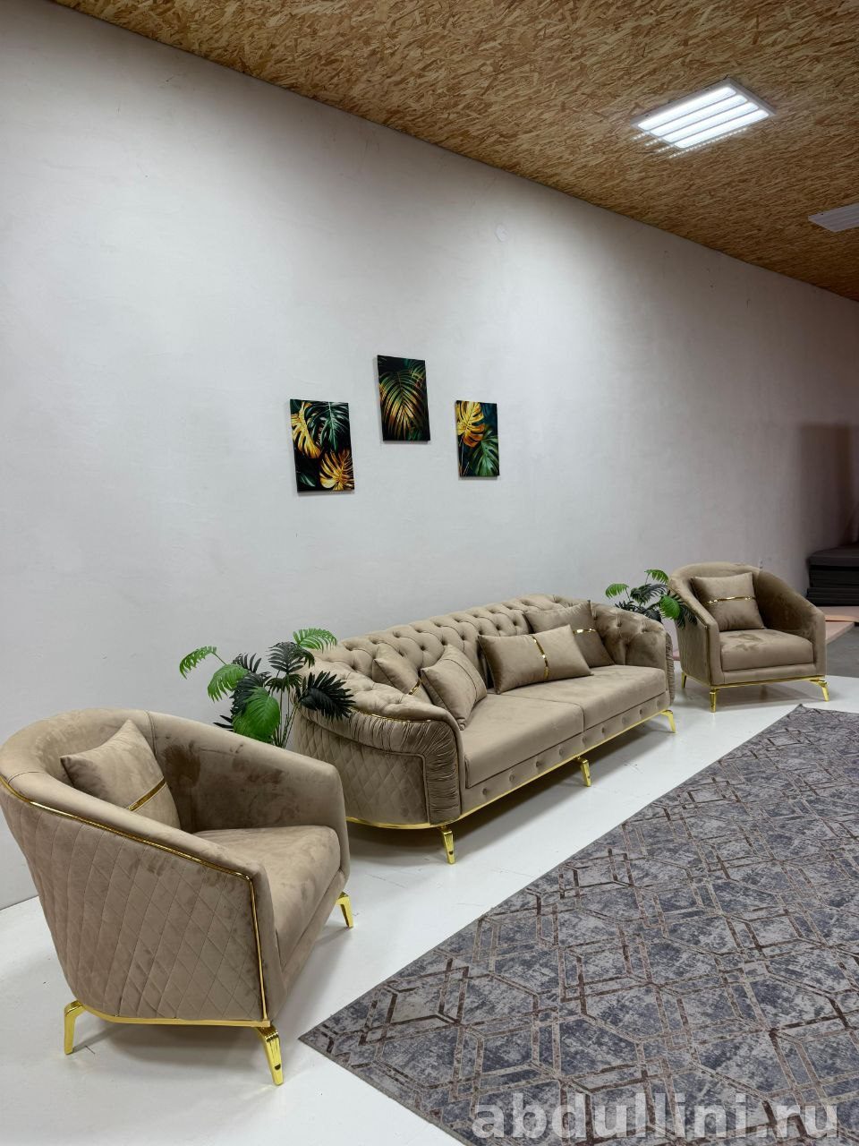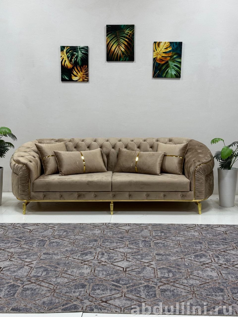 - Декор: золотистые полосы на подушках, черные рамы картин с тропическими листьями