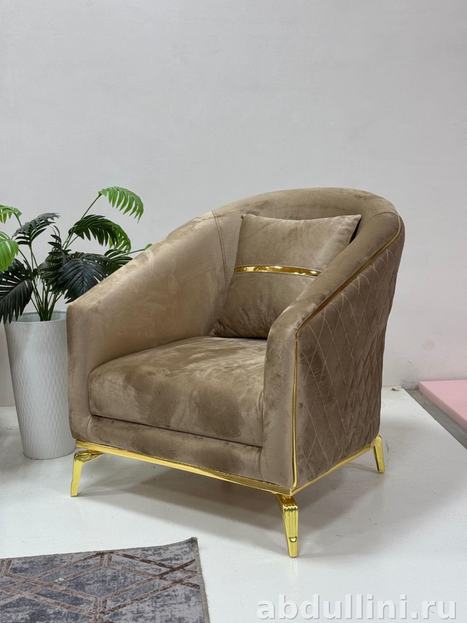 - Материалы: деревянный каркас, металлические ножки с золотистым покрытием