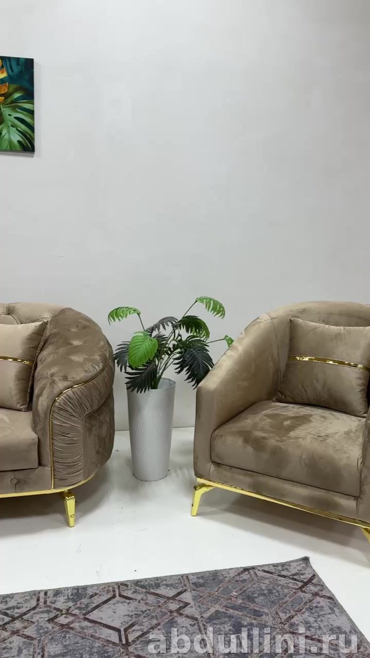 Комплект из дивана и двух кресел в приглушенном бежевом цвете с золотистыми акцентами. Обивка — мягкий велюр с бархатистой текстурой, приятная на ощупь. Стильная стяжка «капитоне» на спинках добавляет ретро-шика.