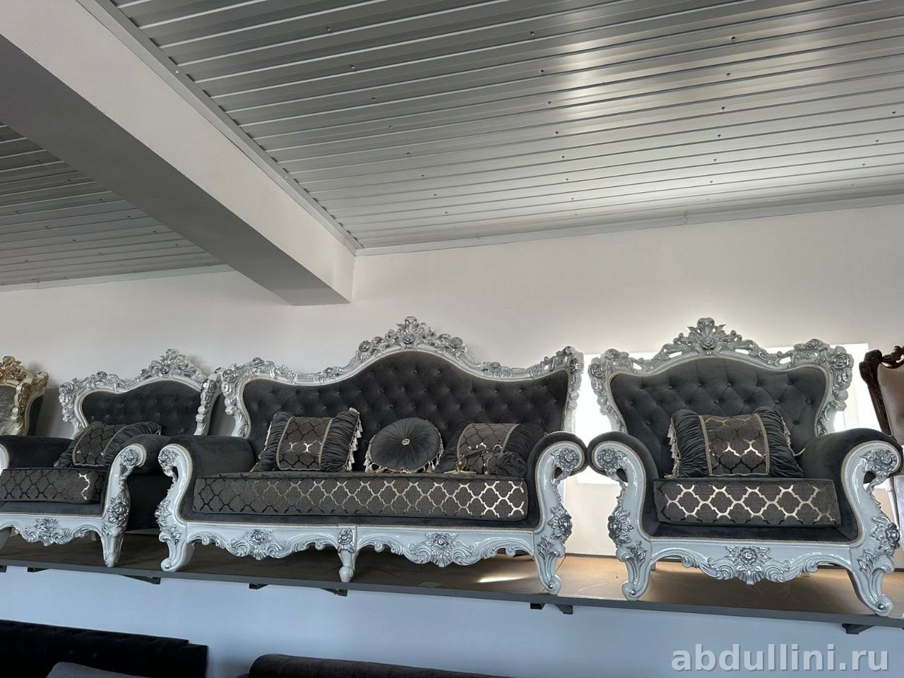 Этот комплект мебели включает трехместный диван и два кресла, выполненные в едином стиле. Основной цвет обивки – глубокий серый с матовой текстурой. Каркас выполнен в белом цвете с серебристой отделкой, имитирующей патину. Декоративные резные узоры в виде цветов и листьев украшают подлокотники, спинку и основание мебели.