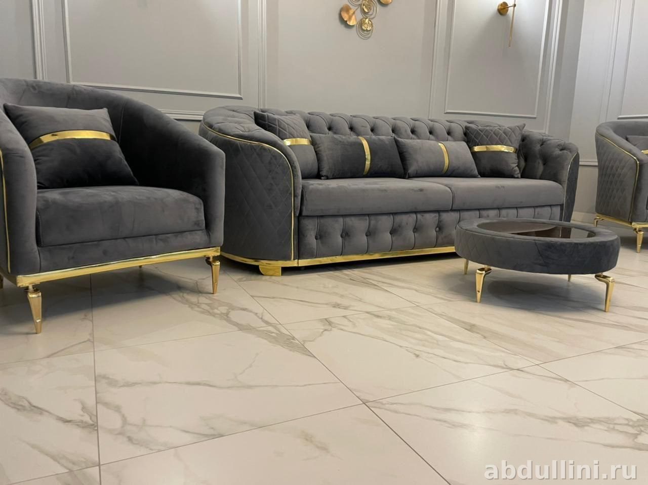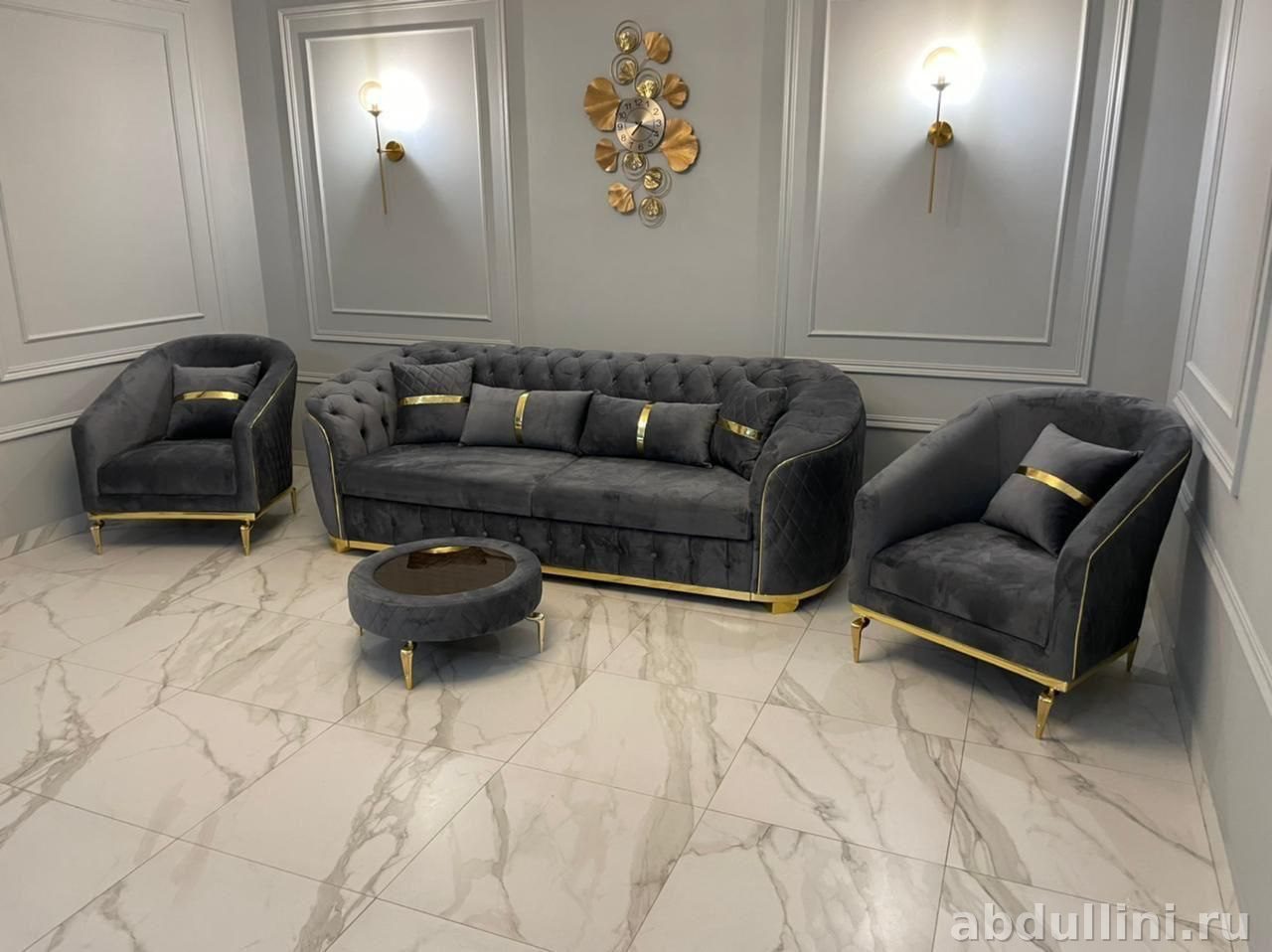 Серый трехместный диван с капитоне и два полукруглых кресла в стиле ар-деко. В комплекте круглый журнальный столик с золотистыми ножками. Обивка — мягкий велюр, каркас из массива дерева.