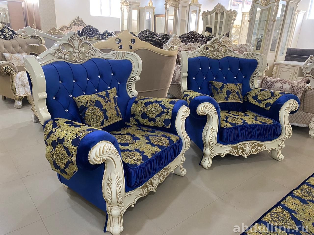 Комплект мебели «ФАРАОН» — это стильное решение для вашего интерьера. Включает трехместный диван и два кресла, выполненные в классическом стиле с элементами декора. Основной цвет обивки — насыщенный королевский синий, дополненный золотистыми узорами на подушках и сиденьях. Каркас мебели имеет глянцевое покрытие цвета слоновой кости с резными золотистыми акцентами.