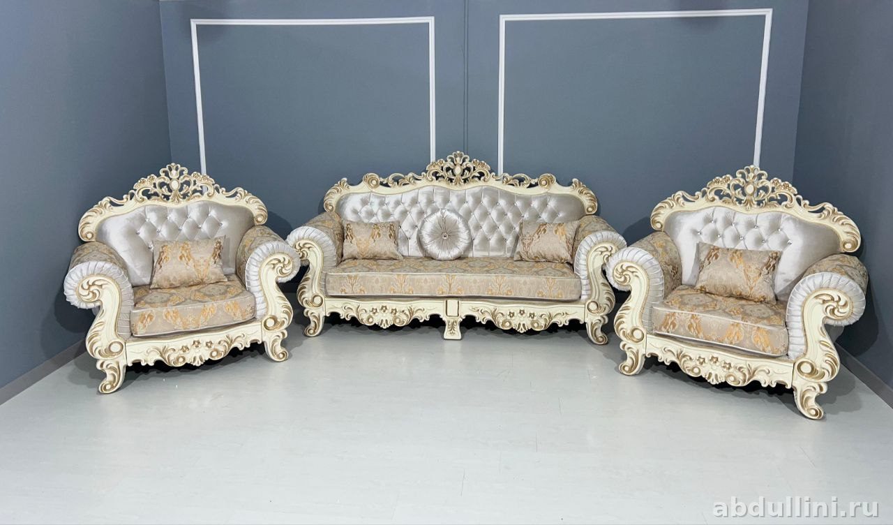 Комплект Корона 2 включает трехместный диван и два кресла. Диван длиной 230 см, кресла — 130 см каждый. Общий размер комплекта — 490 см. Мебель выполнена в классическом стиле с элементами барокко, что видно по резным декоративным элементам и изогнутым формам.