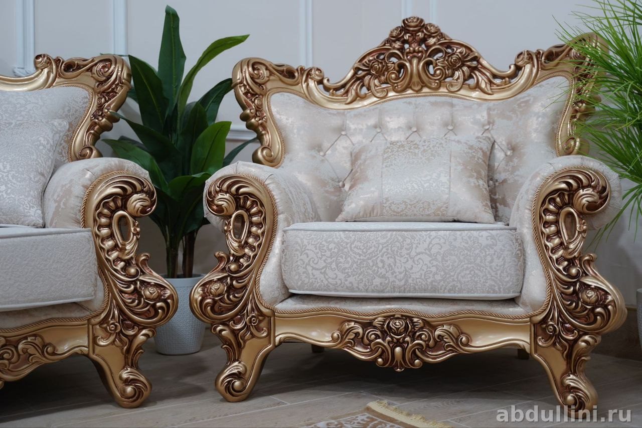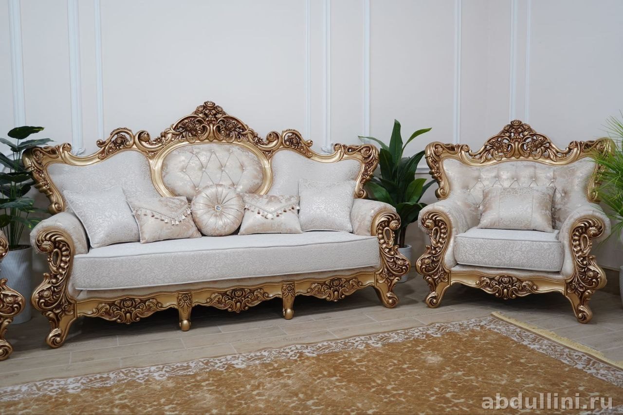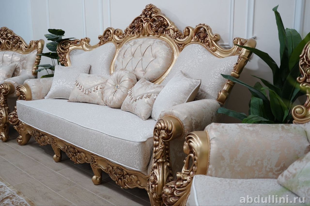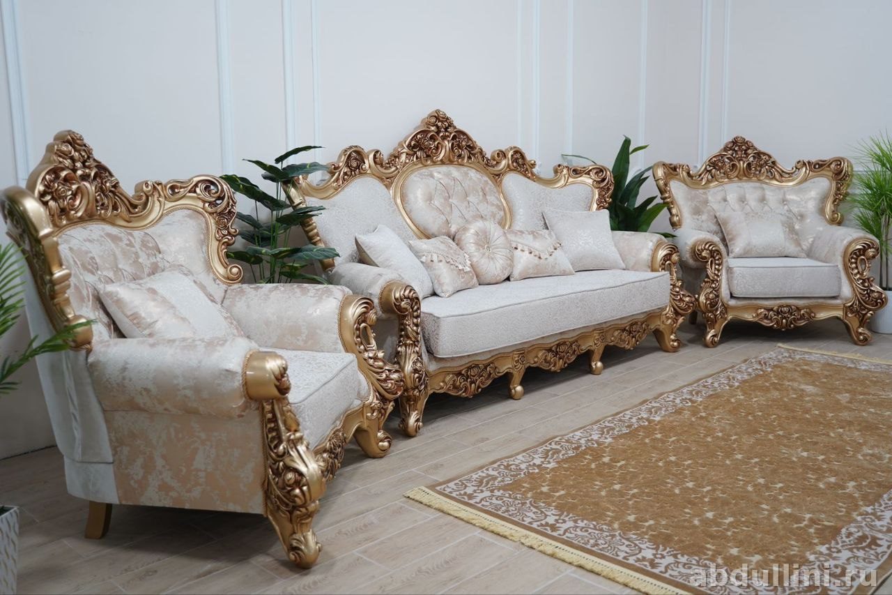 Готовый набор для гостиной: диван и два кресла с резными золотистыми элементами. Обивка — кремовый жаккард с растительным узором, подушки с кисточками в комплекте.