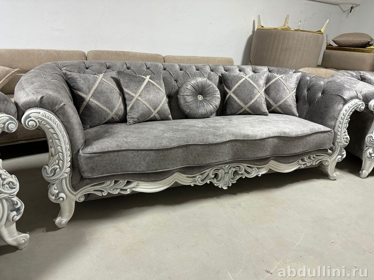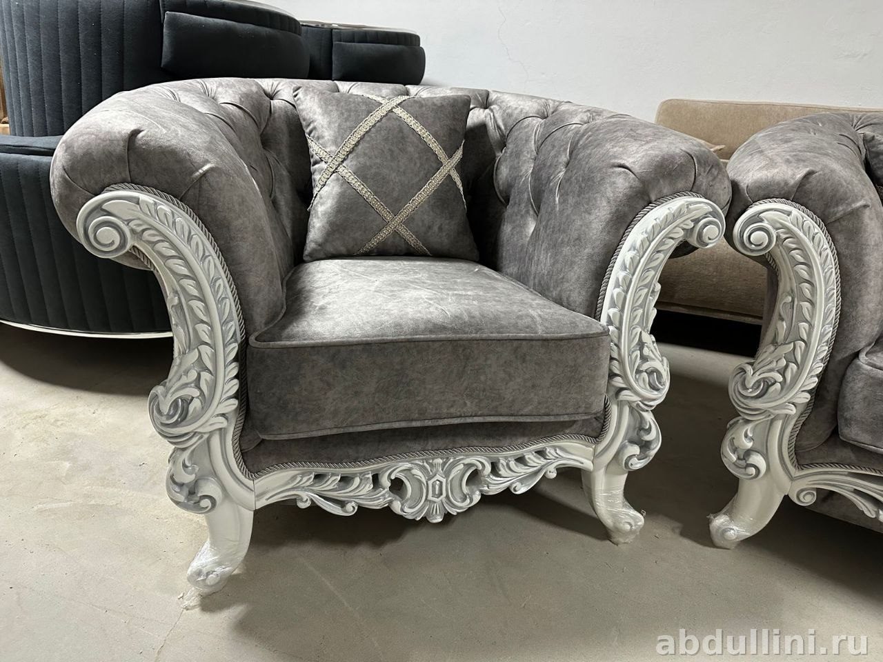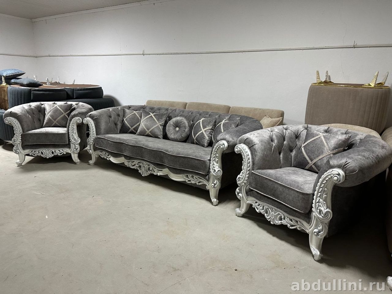 Комплект состоит из трехместного дивана и двух кресел, выполненных в стиле неоклассики с элементами классики. Мебель подходит для гостиной или просторной комнаты, создавая красивый интерьер.