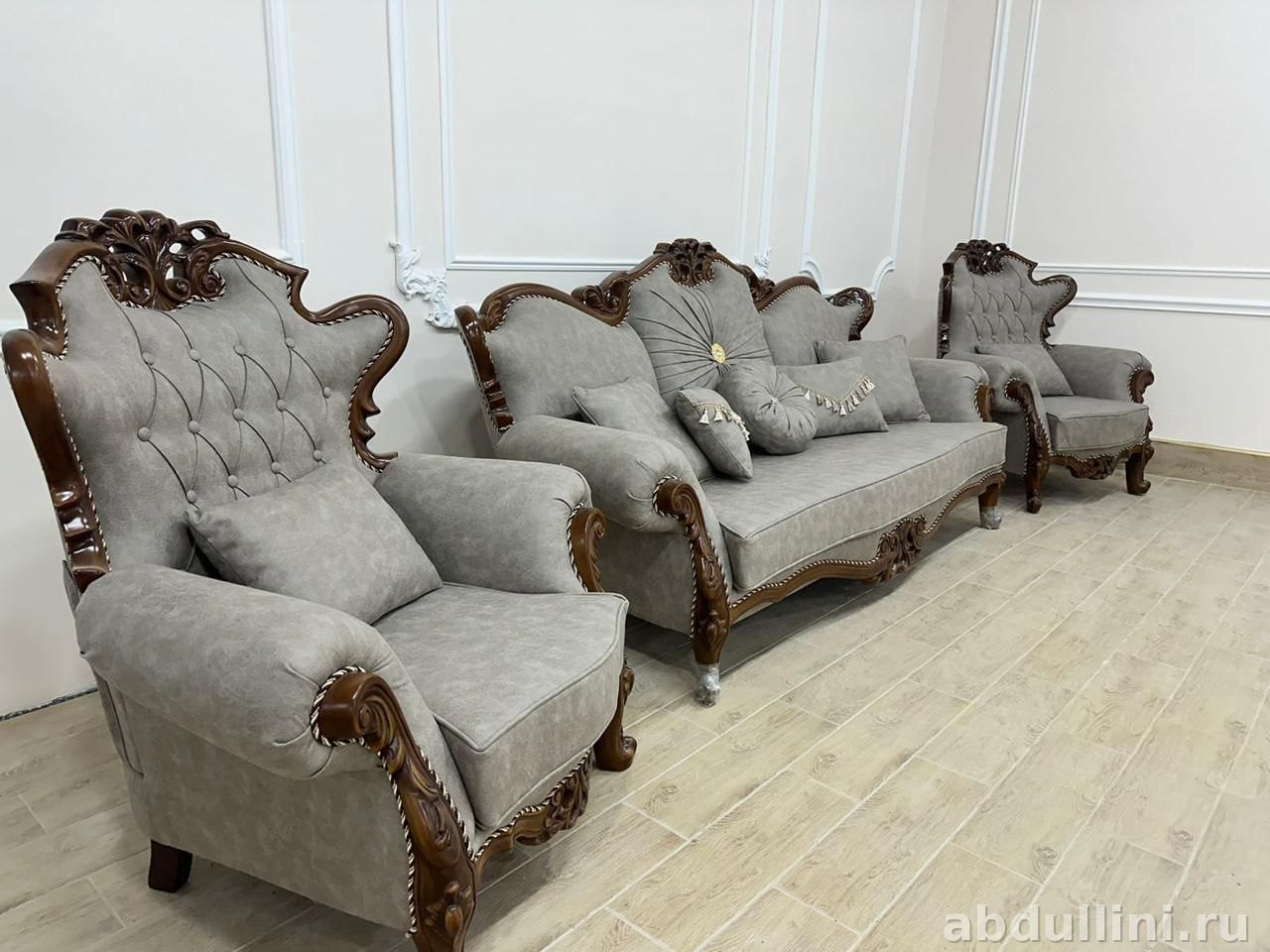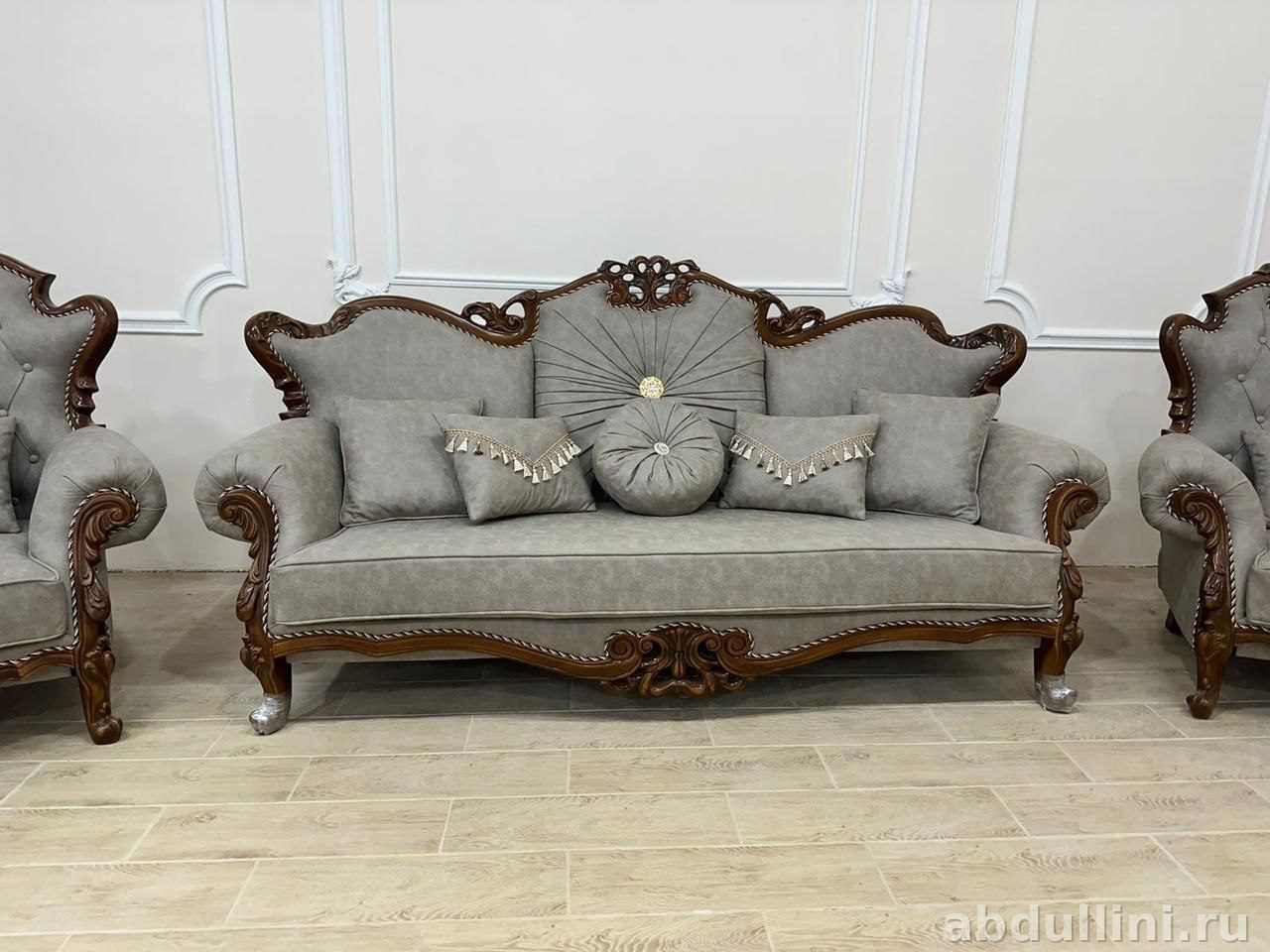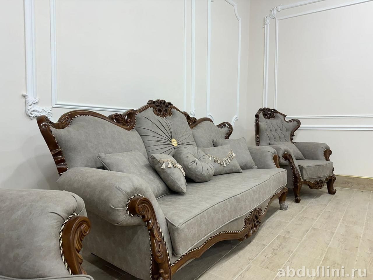 - Декоративные элементы: резные подлокотники, фигурная спинка дивана, декоративные подушки с кисточками.
