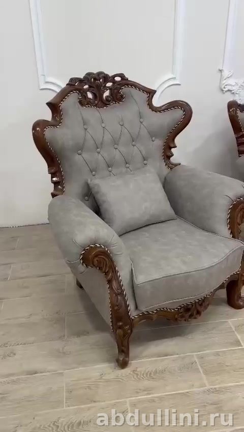 Диван имеет фигурную спинку с драпировкой в центре, округлые подлокотники с резьбой и удобное сиденье шириной 175 см. Кресла компактные, с шириной сиденья 48 см, что делает их удобными для размещения в любом интерьере.